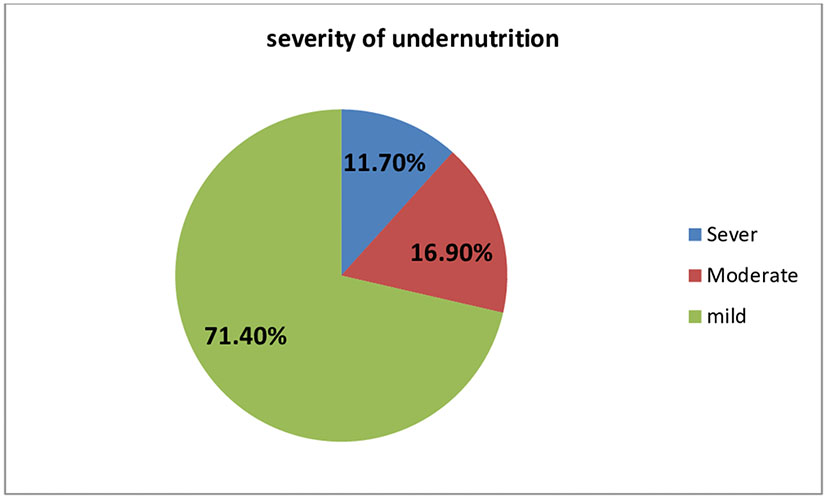 The total level of undernutrition among individuals on ART in this study was 16.0% (n = 154) (95% CI = 13.8–18.3). Among the 154 undernourished individuals, 11.7% were severe, 16.9% moderate, and 71.4% were mildly undernourished (Figure 1).