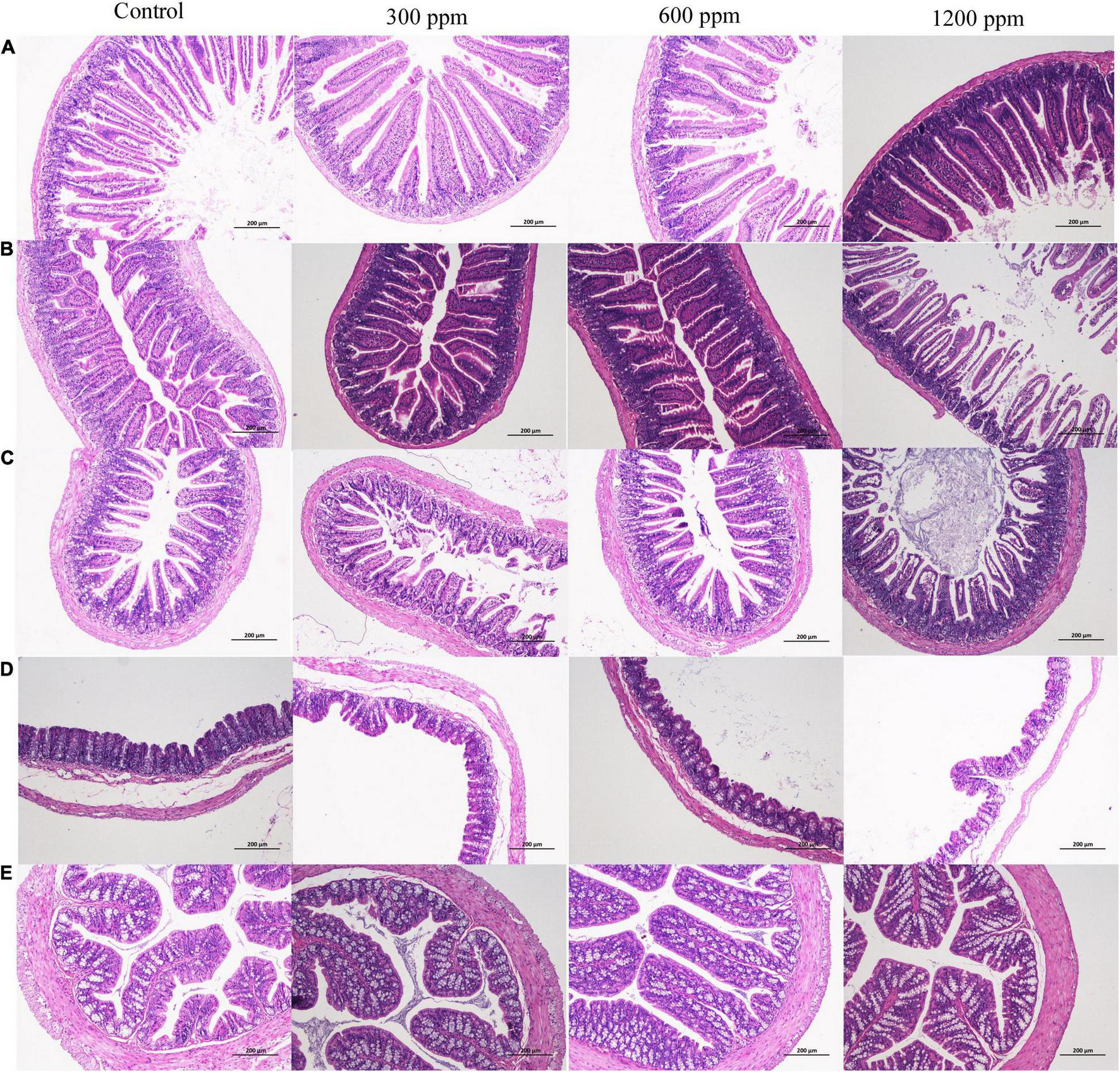 Microscopic observation of intestine. (A) H&E (100×) staining of crypts and villi on duodenum between four groups; (B) H&E (100×) staining of crypts and villi on jejunum between four groups; (C) H&E (100×) staining of crypts and villi on ileum between four groups; (D) H&E (100×) staining of crypts and villi on cecum between four groups; (E) H&E (100×) staining of crypts and villi on colon between four groups.