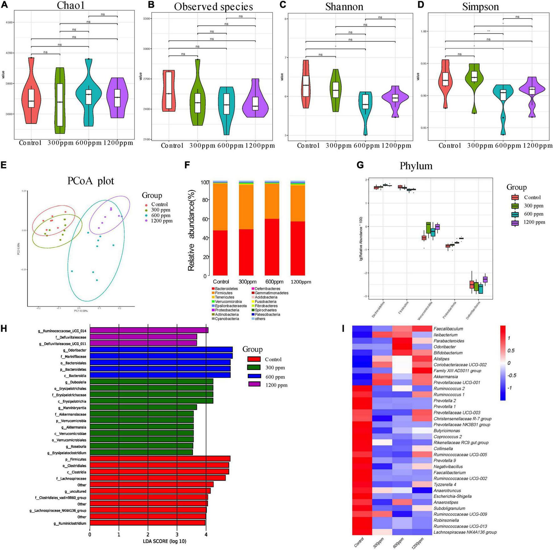Among the bioinformatic analyses, a total of 77,742, 77,686, 77,120, and 75,051 valid tags were obtained for the four groups, accounting for 90.62% (control group), 91.40% (300 ppm group), 91.93% (600 ppm group), and 91.22% (1200 ppm group) of raw sequences, respectively (Supplementary Data 1). Taxonomic analysis revealed a total of 17 bacterial phyla, 35 classes, 93 orders, 149 families, 319 genera, and 88 species. As shown in Figures 2A–D, there were no significant differences in the alpha diversity indices (Chao1, observed species, and Shannon indices) among the four groups (P > 0.05), but 600 ppm group had a lower Simpson index than the control group and 300 ppm group (P < 0.05), while the Simpson index at 300 ppm was significantly different from that in the 1,200 ppm group (P < 0.05; Figure 2D). The microbial community structure of all samples (beta diversity) was visualized using PCoA (Figure 2E). The two factors (PC1 and PC2) accounted for 8.08 and 6.36% of the sample variation, respectively. The PCoA based on the bacterial OTUs showed that the samples clustered together, which indicated a shift in the gut bacterial community among the four groups (Figure 2E). Our results showed that the abundance of phylum Bacteroidetes was significantly increased by ε-polylysine, and the abundance of phylum Firmicutes was significantly decreased (P < 0.05), which was a domain phylum in all samples (Figures 2F,G and Supplementary Data 2). The abundance of Proteobacteria and Verrucomicrobia was higher in the ε-polylysine groups than in the control group (P < 0.05; Figure 2G). A total of 96 different genera were identified by Wilcoxon text analysis (Supplementary Data 3). The LEfSe analysis revealed that the genera had effects among the four groups (Figure 2H). Ten genera were more abundant in the ε-polylysine group, including Faecalibaculum, Ileibacterium, Parabacteroides, Odoribacter, Bifidobacterium, Alistipes, Coriobacteriaceae UCG-002, Family XIII AD3011 group, Akkermansia, and Prevotellaceae UCG-001.