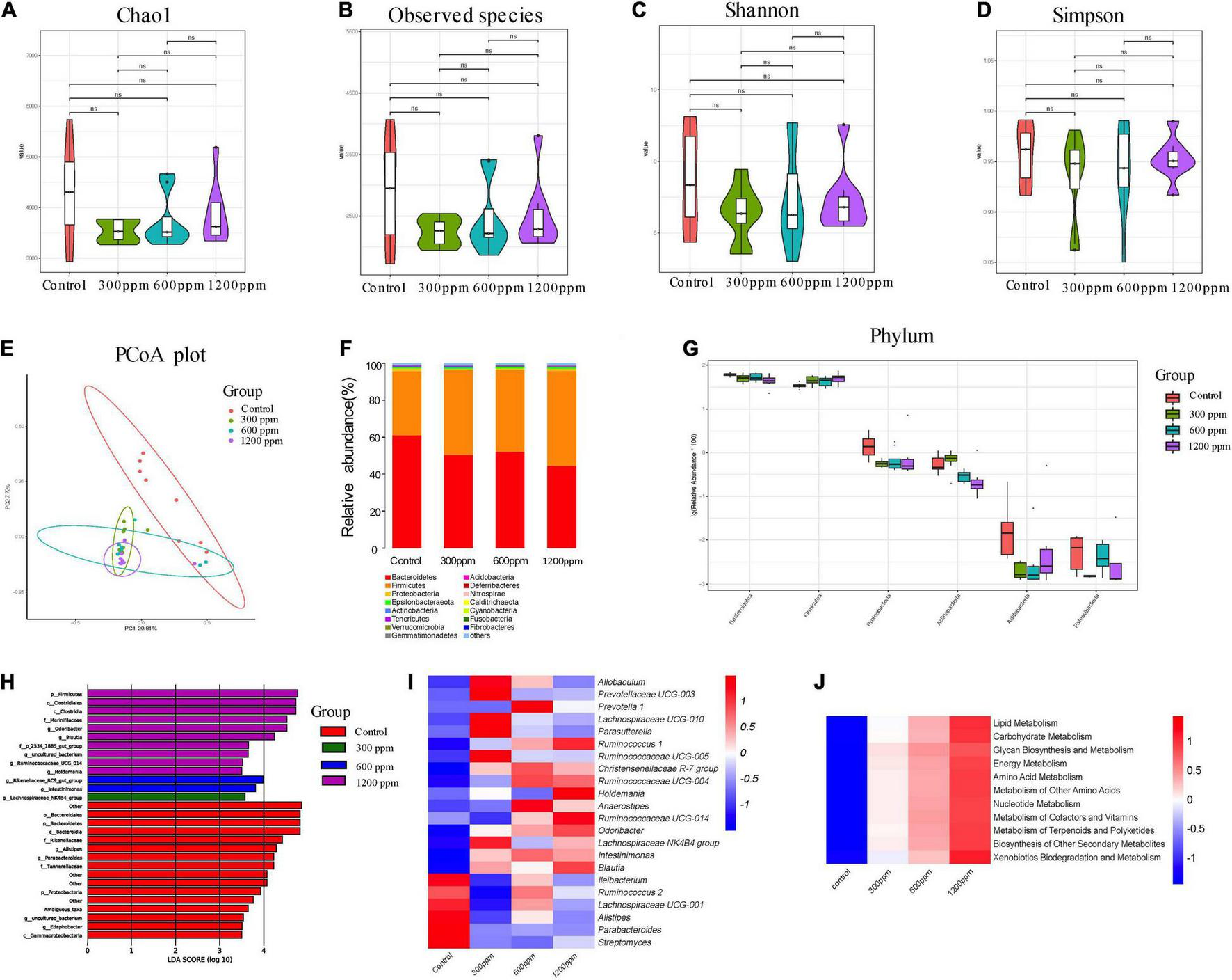 Shifts in the fecal bacterial composition of C57 mice at 10 weeks. (A) Bacterial alpha diversity determined by Chao1 index. (B) Bacterial alpha diversity determined by Observed species index. (C) Bacterial alpha diversity determined by Shannon index. (D) Bacterial alpha diversity determined by Simpson index. (E) PCoA was performed at the operational taxonomic unit (OTU) level based on Bray–Curtis metrics for all samples at different time. (F) Comparison of the relative abundance of top 15 phyla. (G) The different phylum compositions of the experimental group. (H) LefSe results from the fecal microbiota indicating genera significantly associated with the control and ε-polylysine group samples. (I) Heat map and hierarchical clustering of differentially abundant gut bacterial at genus level. (J) Heat map of KEGG pathway by PICRUSt analysis.