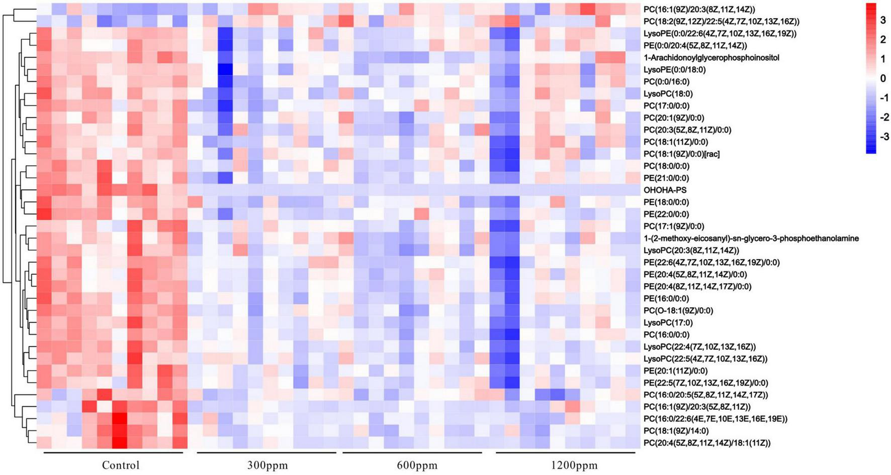 Metabolic patterns in the experiment groups. (A) PCA analysis between control group and 300 ppm group. (B) Clustering analysis of OPLS-DA in the control group and 300 ppm group. (C) PCA analysis between control group and 600 ppm group. (D) Clustering analysis of OPLS-DA in the control group and 600 ppm group. (E) PCA analysis between control group and 600 ppm group. (F) Clustering analysis of OPLS-DA in the control group and 600 ppm group. (G) Comparison of the abundance of major metabolite classifications. (H) Comparison of the abundance of Glycerophospholipids. (I) PC/PE radio. (J) The pathways in the control group and 300 ppm group. (K) The pathways in the control group and 600 ppm group. (L) The pathways in the control group and 1,200 ppm group.