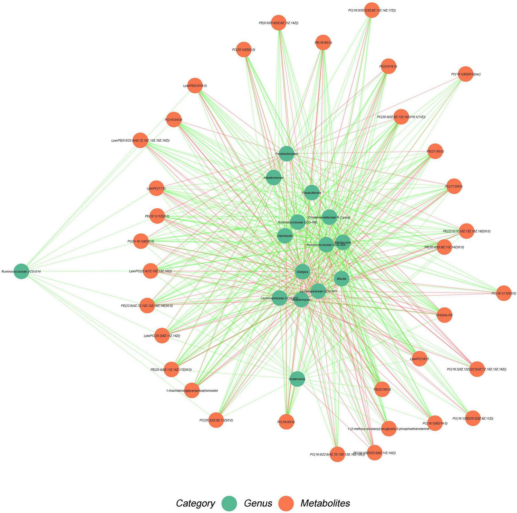 The presence of gut microbes significantly elevated PC levels in the colon and significantly decreased PE levels in the ileum from GF and SPF mice (71). Moreover, fuzhuan brick tea ameliorated high-fat-diet-induced abnormal glycerophospholipid metabolism by increasing serum levels of PCs, LysoPCs, and PC/PE radio, which in a gut microbiota dependent manner (72). In the study of tumor, the gene Alistipes interfered glycerophospholipid metabolism, and it was negatively correlated with the level of PE and PC (73), which was contrary to our experimental results. The direct correlation study between gut microbes and metabolites in the glycerophospholipid metabolic pathway is rare, and indirect correlation studies have shown an important role in nutritional metabolic syndrome or health diseases (9, 74). This experiment required further research and verification on the correspond metabolism mechanism of glycerophospholipid with the microbiota directly.