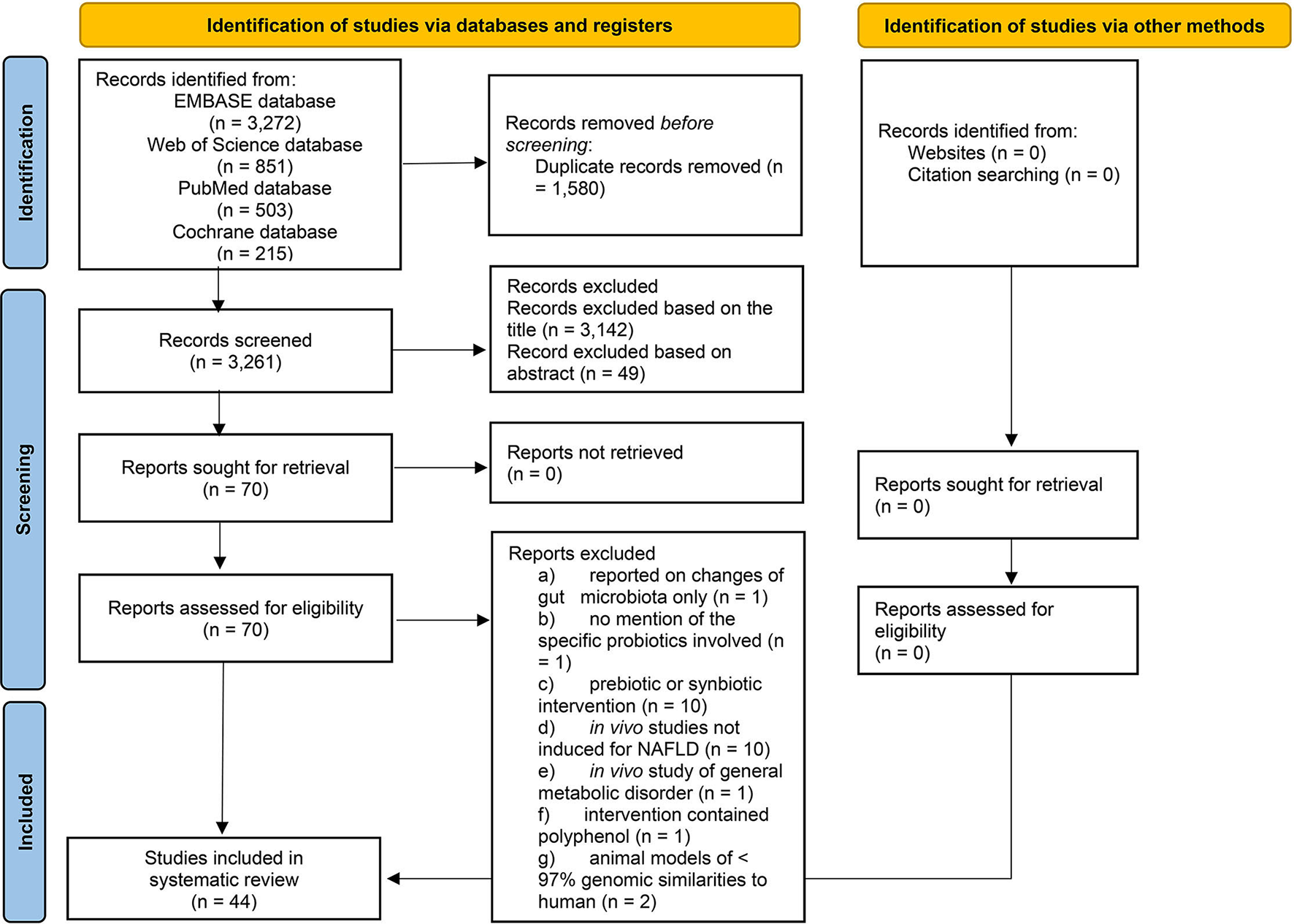 The inclusion criteria of this systematic review included (a) diet-induced or genetically induced NAFLD or NASH animal models; (b) probiotic intervention(s); (c) fermented food with known probiotic genus(genera)/ strain(s); (d) at least one of the following measurable parameters was assessed: liver histology (steatosis with or without inflammation), liver function tests [including liver enzymes, i.e., serum alanine aminotransferase (ALT), aspartate aminotransferase (AST), alkaline phosphatase (ALP), and gamma-glutamyl transferase (GGT), and serum bilirubin], lipid parameters [hepatic and serum profiles including lipid, triacylglycerol (TAG), total cholesterol (TC), low-density lipoprotein cholesterol (LDL-C), high-density lipoprotein cholesterol (HDL-C), esterified cholesterol, free cholesterol, phospholipid (PL), and non-esterified fatty acid (NEFA)], oxidative markers [e.g., malondialdehyde (MDA) and transforming growth factor beta (TGF-β)], inflammatory markers [e.g., tumor necrosis factor alpha (TNF-α), interleukin-6 (IL-6), interleukin 1beta (IL-1β), and necrosis factor kappa B (NF-κB)], glycaemic parameters [i.e., fasting blood glucose (FBG), fasting insulin, and homeostasis model assessment of insulin resistance (HOMA-IR)], body or organ weight and gut related changes [i.e., gut microbiota, gut-derived products [i.e., endotoxins, lipopolysaccharide (LPS), short-chain fatty acid (SCFA)], and intestinal permeability]. The exclusion criteria included (a) animal models of < 97% genomic similarities to human (e.g., rooster and fish); (b) in vivo studies of other diseases that caused steatosis or steatofibrosis (e.g., viral hepatitis and carcinogenesis); (c) combination of probiotics with other interventions (e.g., bioactive compounds, drugs, and herbs); (d) pre- or synbiotics; (e) abstracts or conference proceedings, in vitro studies, clinical studies, review papers, and non-English literature; and (f) use of secondary data from other published works. The eligibility of all potential studies identified for inclusion was independently assessed by four authors (i.e., FS, KR, SML, and CFN). Discrepancies on study inclusion were resolved through discussion and consensus.