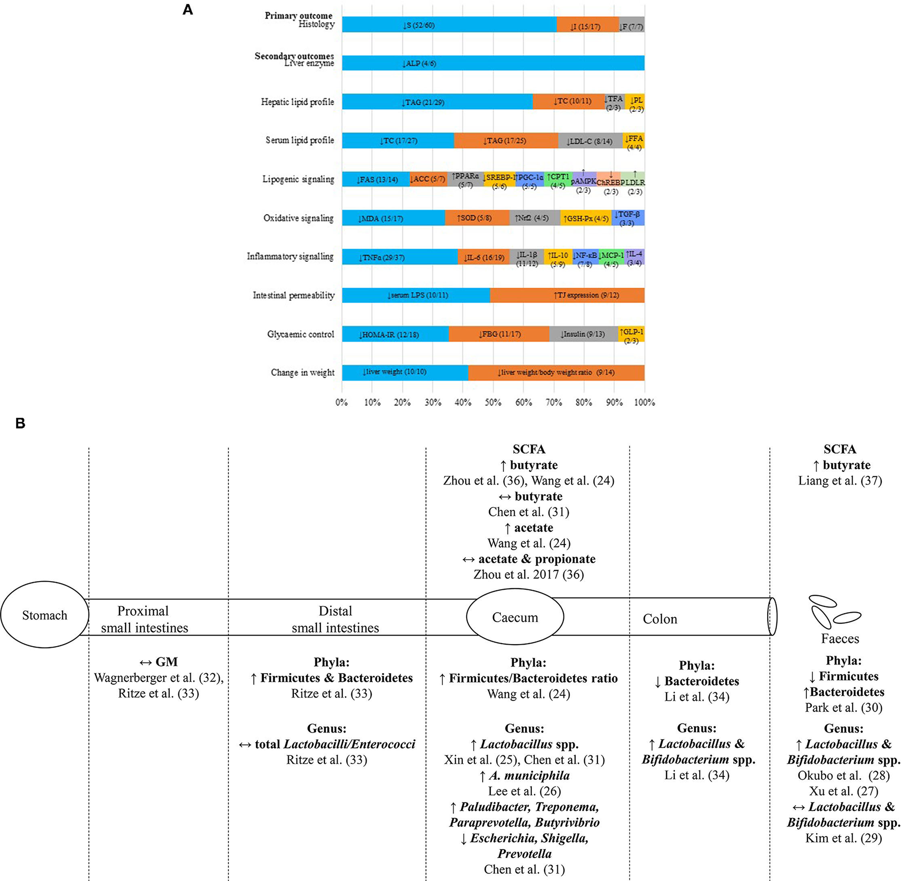 Figure 3. Summary of hepatoprotective effects of probiotic supplementations on NAFLD in vivo. (A) The infographic represents the commonly reported biochemical and molecular parameters (>2 studies) with the most reported trend of significant findings (>50% studies; p < 0.05) of NAFLD animal models supplemented with probiotics. Each horizontal stacked column represents the total number of findings which had reported the common parameters of the included studies. The number in each data series of each stacked column represents the most reported trend of significant findings (>50%; p < 0.05) out of the total number of findings reported in the included studies on each parameter. (B) The illustration represents the reported changes of gut microbiota and SCFA compositions at various sites along the gut of NAFLD animal models supplemented with probiotics. ACC, Acetyl-CoA carboxylase; ALP, alkaline phosphatase; A. municiphila, Akkermansia miniciphila; ChREBP, carbohydrate response-element binding protein; CPT1, carnitine palmitoyltransferase I; E. coli, Escherichia coli; F, fibrosis; FAS, fatty acid synthase; FBG, fasting blood glucose; GLP-1, glucagon-like peptide-1; GM, gut microbiota; GSH-Px, glutathione peroxidase; HOMA-IR, homeostasis model assessment for insulin resistance; I, inflammation; IL-1β, interleukin-1; IL-4, interleukin-4; IL-6, interleukin-6; IL-10, interleukin-10; HDL-C, high-density lipoprotein cholesterol; LDL-C, low-density lipoprotein cholesterol; LDLR, low-density lipoprotein receptor; LPS, lipopolysaccharide; MDA, malanoyl dialdehyde; NF-κB, necrosis factor kappa B; Nrf2, nuclear factor erythroid 2-related factor 2; pAMPK, phosphorylated AMP-activated protein kinase; PL, phospholipid; PPARɤ, peroxisome proliferator-activated receptor alpha; PGC-1ɑ, peroxisome proliferator-activated receptor gamma coactivator 1 alpha; S, steatosis; SCFA, short chain fatty acid; SOD, superoxide dismutase; SREBP-1, sterol regulatory element-binding protein 1; TAG, triacylglycerol; TC, total cholesterol; TFA, total fatty acid; TGF-α, transforming growth factor beta; TJ, tight junction protein; TLR4, toll-like receptor 4; TNF-α, tumor necrosis factor alpha; ↑, increased; ↓, reduced; ↔, no changes.
