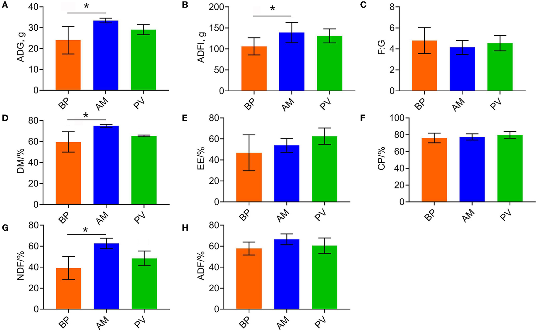 Growth performance and apparent digestibility of meat rabbits. (A) ADG. (B) ADFI. (C) F:G. (D) DM. (E) EE. (F) CP. (G) NDF. (H) ADF. Average daily gain (ADG), Average daily feed intake (ADFI), Average daily gain: Average daily feed intake (F:G), Dry matter (DM), Ether extract (EE), Crude protein (CP), Neutral detergent fiber (NDF), Acid detergent fiber (ADF), beet pulp treatment (BP), alfalfa meal treatment (AM), and peanut vine treatment (PV). The asterisks symbol indicates significant differences (*0.01 < P ≤ 0.05, **0.001 < P ≤ 0.01, ***P ≤ 0.001).