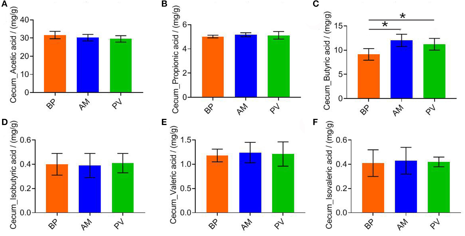 The cecal SCFAs content of meat rabbits was evaluated after feeding meat rabbits with different fiber source diets (Figure 3), It was found that the content of butyric acid in PV and AM treatments was significantly higher than that in BP treatment (P < 0.05) (Figure 3C). There was no significant difference in other SCFAs between treatments (P > 0.05) (Figures 3A,B,D–F).