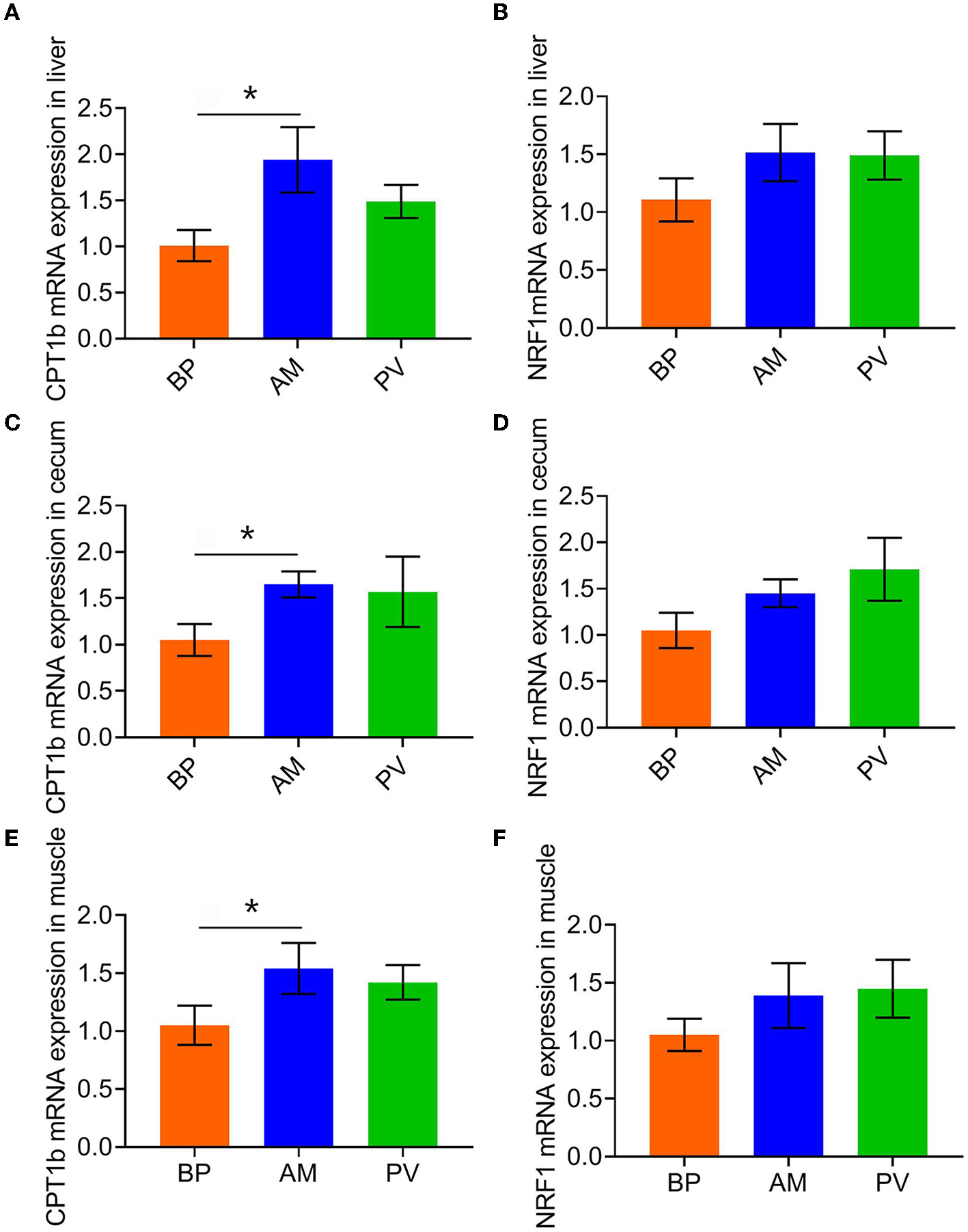 After feeding meat rabbits with different fiber source diets, the expression of mitochondrial biosynthesis genes in liver, cecum, and muscle of meat rabbits was evaluated (Figure 4). It was found that compared with BP, the mRNA expression of CPT1b was significantly higher in AM treatment (P < 0.05) (Figures 4A,C,E), and that in PV treatment had a tendency to increase (P > 0.05). There was no significant difference in the mRNA expression of NRF1 among treatments (P > 0.05) (Figures 4B,D,F).