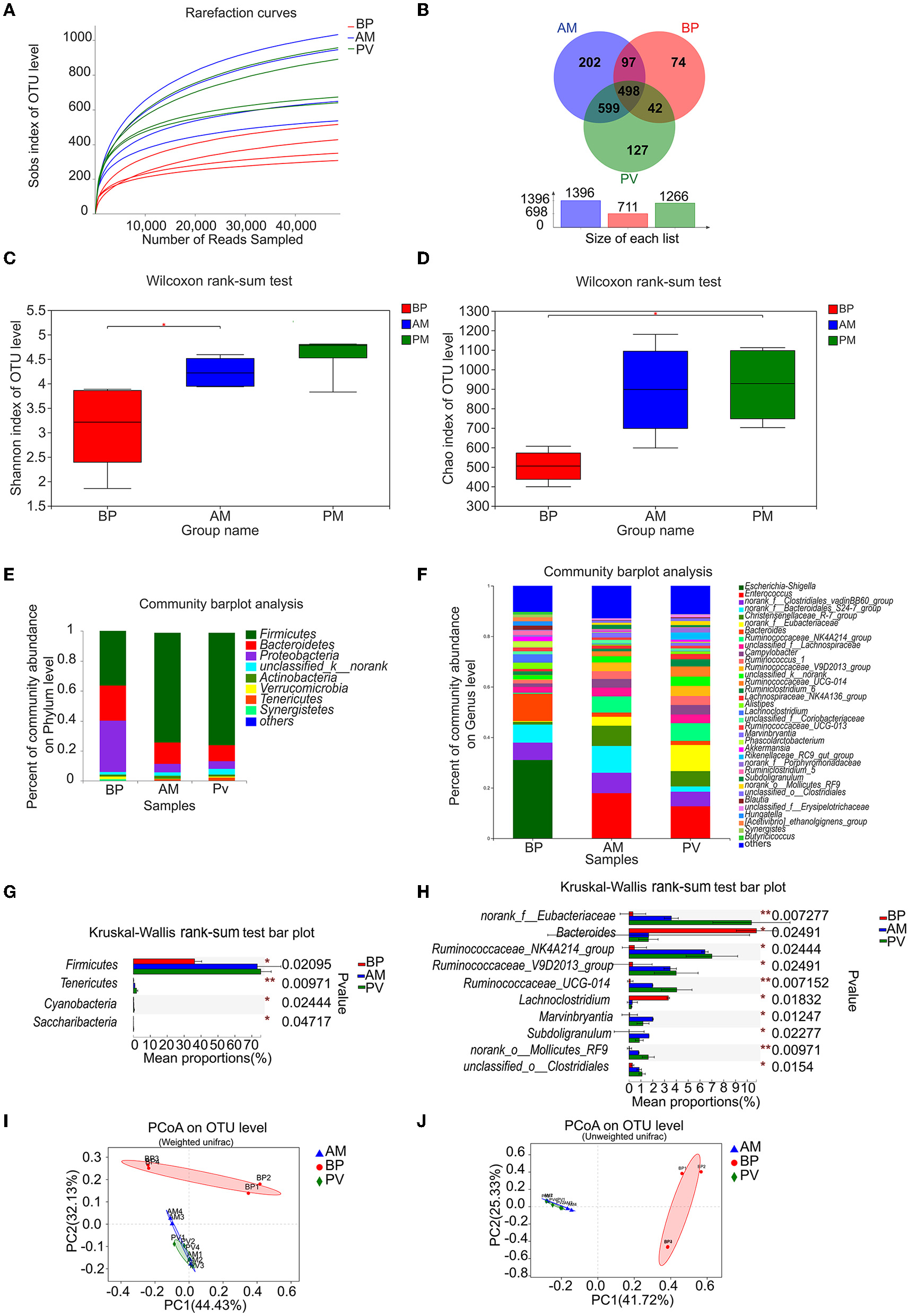Microbiota community in the cecum of meat rabbits. (A) Sobs index of OTU level, (B) Venn analysis, (C) Shannon index of OTU level, (D) Chao index of OTU level, (E) Microbiota community at the phyla level, (F) Microbiota community at the genus level, (G) Composition difference at the phyla level, (H) Composition difference at the genus level, (I) PCoA on OTU level by weighted-UniFrac distance, and (J) PCoA on the OTU level by unweighted-UniFrac distance. beet pulp treatment (BP), alfalfa meal treatment (AM), operational taxonomic unit (OTU), principal coordinates analysis (PCoA), and peanut vine treatment (PV).The asterisks symbol indicates significant differences (*0.01 < P ≤ 0.05, **0.001 < P ≤ 0.01, ***P ≤ 0.001).