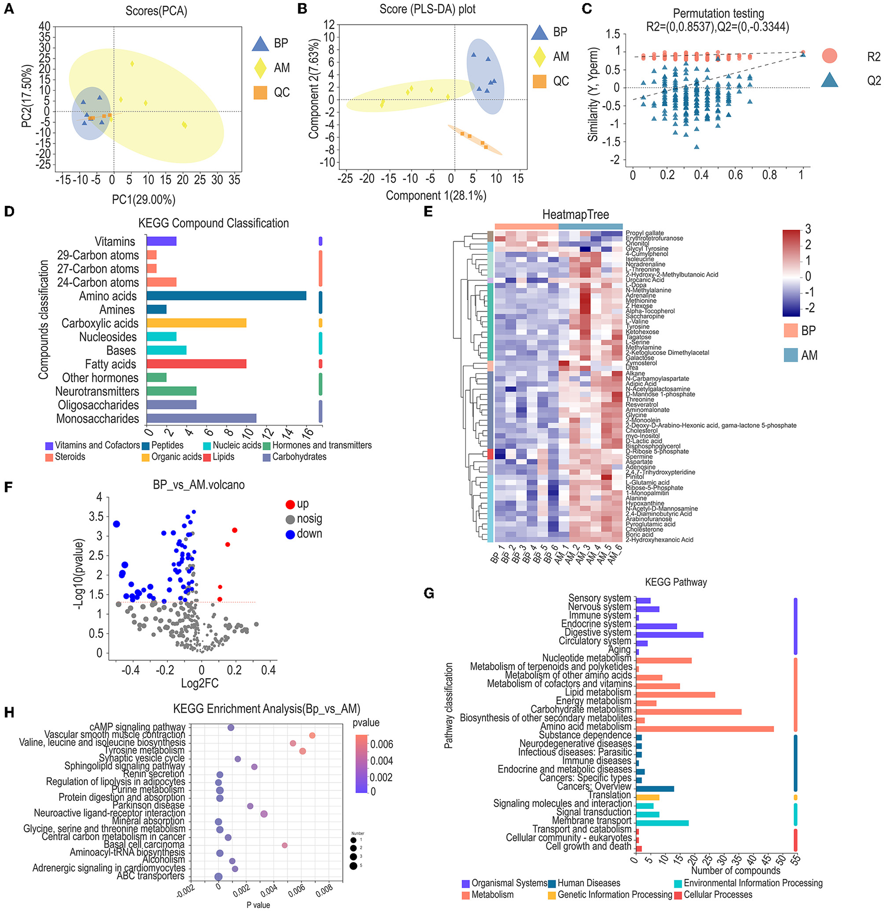 Metabolic spectrum analysis of longest dorsal muscle in meat rabbit. (A) PCA, (B) PLS-DA, (C) Permutation testing, (D) KEGG compound classification, (E) Heatmap tree, (F) Volcano diagram of differential metabolites, (G) KEGG pathway, and (H) KEGG enrichment analysis. Beet pulp treatment (BP), alfalfa meal treatment (AM), and peanut vine treatment (PV).