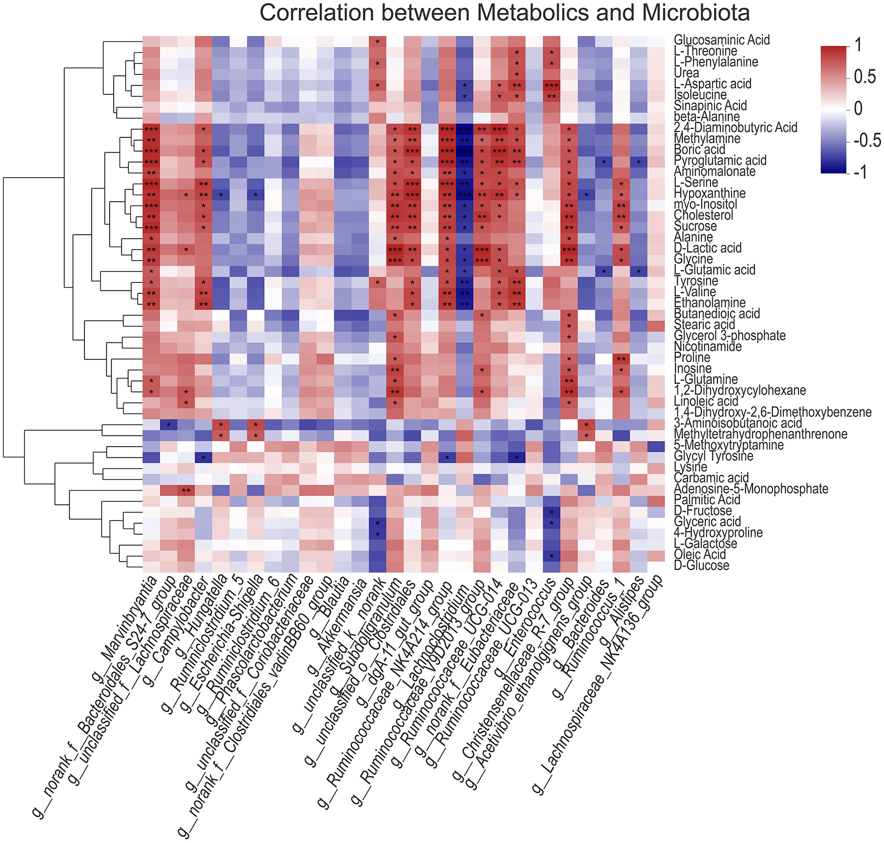 Correlation analysis between gut microbiota and metabolic spectrum of longissimus dorsi muscle. The asterisks symbol indicates significant correlation (*0.01 < P ≤ 0.05, **0.001 < P ≤ 0.01, ***P ≤ 0.001).