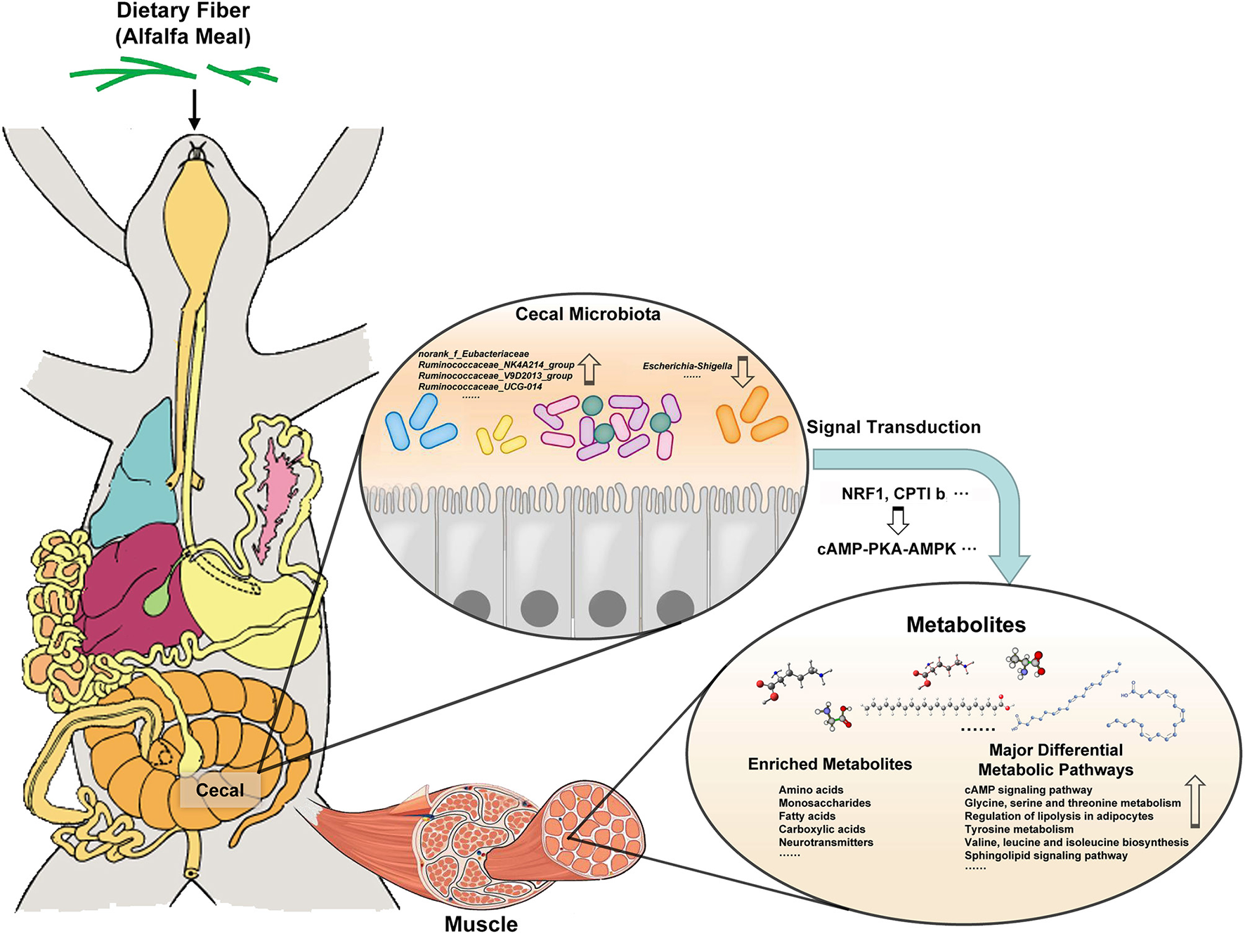 The muscle quality of meat rabbits is considered to be the key growth characteristic of meat rabbits (15). However, a few studies have revealed the relationship between gut microbiota and rabbit meat quality, which may affect muscle metabolism. For example, after transplanting bacteria from obese or lean pigs, sterile mice replicated the fiber characteristics and lipid metabolism characteristics of donor skeletal muscle (16). Interestingly, supplementation of probiotics in mice can also improve muscle quality, promote the slow oxidative muscle phenotype associated with increased muscle endurance, and reduce exercise-induced muscle injury (17). When the gut microbiota is destroyed, the availability of energy substrate is reduced, especially the reduction of glucose may lead to the reduction of muscle glycogen storage to maintain glucose homeostasis, which could prone to muscle injury (18). Therefore, gut microbiota may regulate meat quality through energy metabolism. cAMP–PKA–AMPK signaling pathway is an important energy sensor and regulator in cell life activities (19). It is found that NRF1 and CPTlb are enriched in tissues with high oxidation capacities, such as brown adipose tissue, brain, heart, and skeletal muscle (20). The correlation analysis between gut microbiota and metabolome can better explain the mechanism of physiological activities.