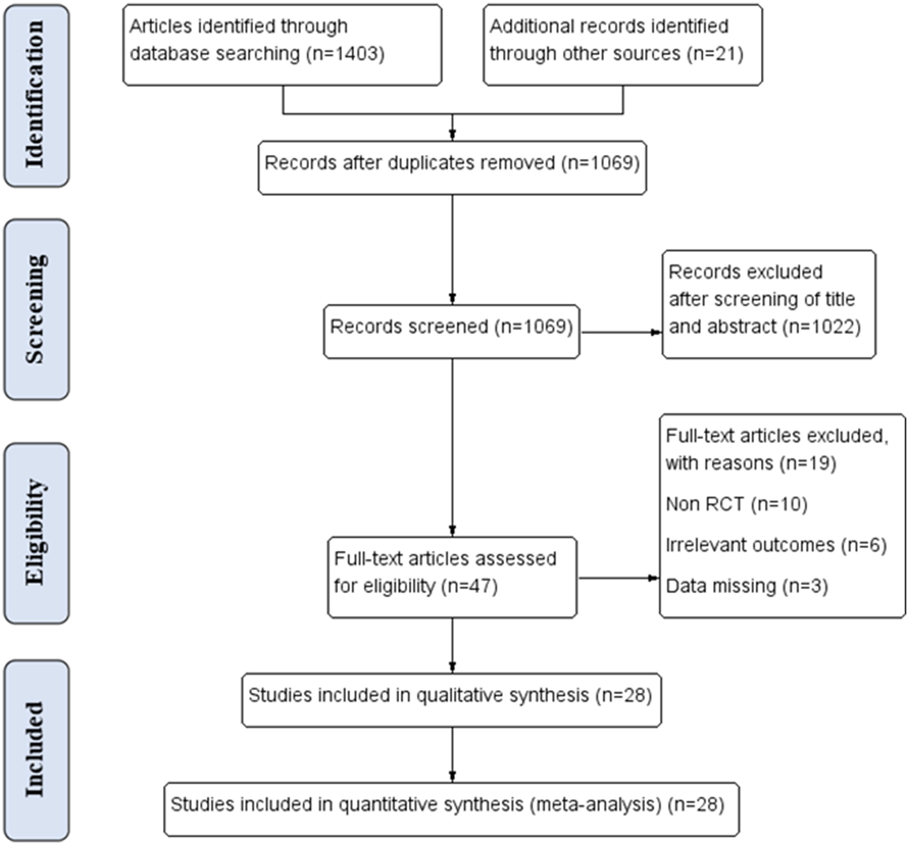 A total of 1,403 articles were searched through databases, and an additional 21 records were manually identified. After removing 355 duplicates, 1,069 records were screened by titles and abstracts. The remaining 47 full-text articles were assessed for eligibility, 19 of which were excluded for different reasons. Finally, a total of 28 studies that included 1,373 participants were analyzed in the network meta-analysis (Figure 1). Details of each article are shown in Supplementary Table S3.