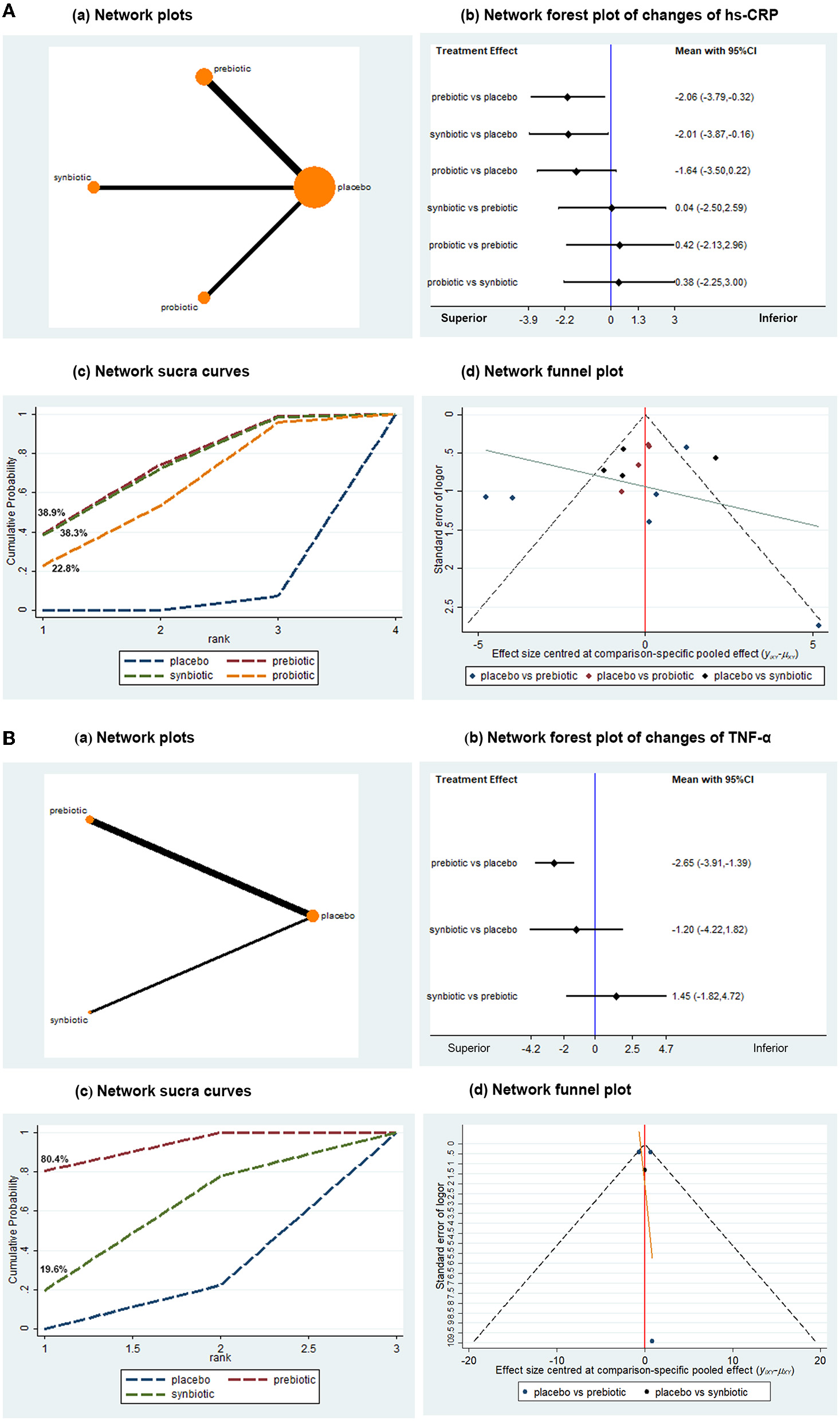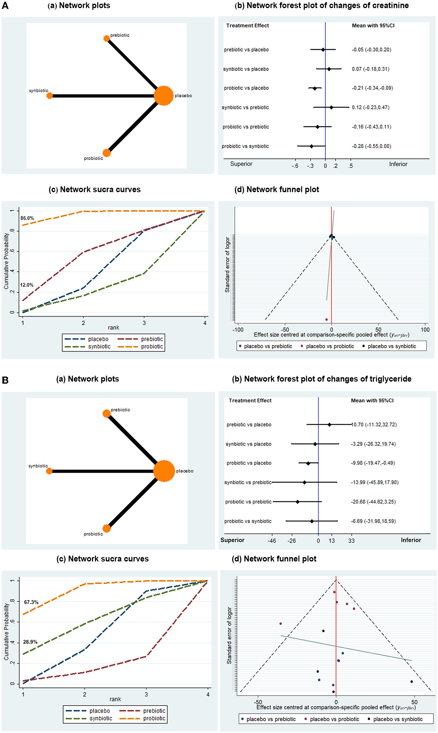 Network meta-analysis results for the effects of probiotic, prebiotic, and synbiotic supplementation on creatinine (A) and triglyceride (B) levels.