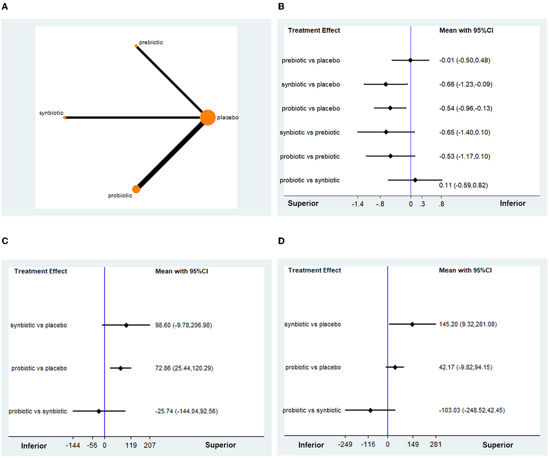 After data preparation, Stata software (version 13.1, USA) was used to perform the network meta-analysis. The functional program package used to process raw data was the “network” package, which is involved in the “mvmeta” package. Statistical assumptions of similarity, transitivity, and consistency of the data were examined with relevant commands to verify the reliability of the analysis results. Various graphs were drawn via the following commands: “networkplot” command was used for drawing network geometry or network plot, “netfunnel” for network funnel plot with random effect model to check publication bias, “intervalplot” for interval plot or forest plot, and “sucra” for treatment rankings and surface area under the cumulative ranking curve (SUCRA) (18). Analysis of heterogeneity mainly relied on subgroup analysis and sensitivity analysis. The treatment effects of probiotics, prebiotics, and synbiotics compared with placebo were expressed as the mean difference (MD) with a 95% confidence interval (CI). The 95% CIs excluding 0 were considered statistically significant.