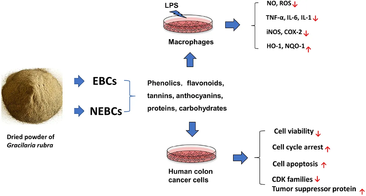 Extractable bioactive components (EBCs) and non-extractable bioactive components (NEBCs) have been isolated from Gracilaria rubra, which contains certain amounts of phenolics, flavonoids, tannins, anthocyanins, proteins, and carbohydrates. Additionally, EBCs and NEBCs displayed anti-colon cancer capacities and anti-inflammatory properties in cell studies.