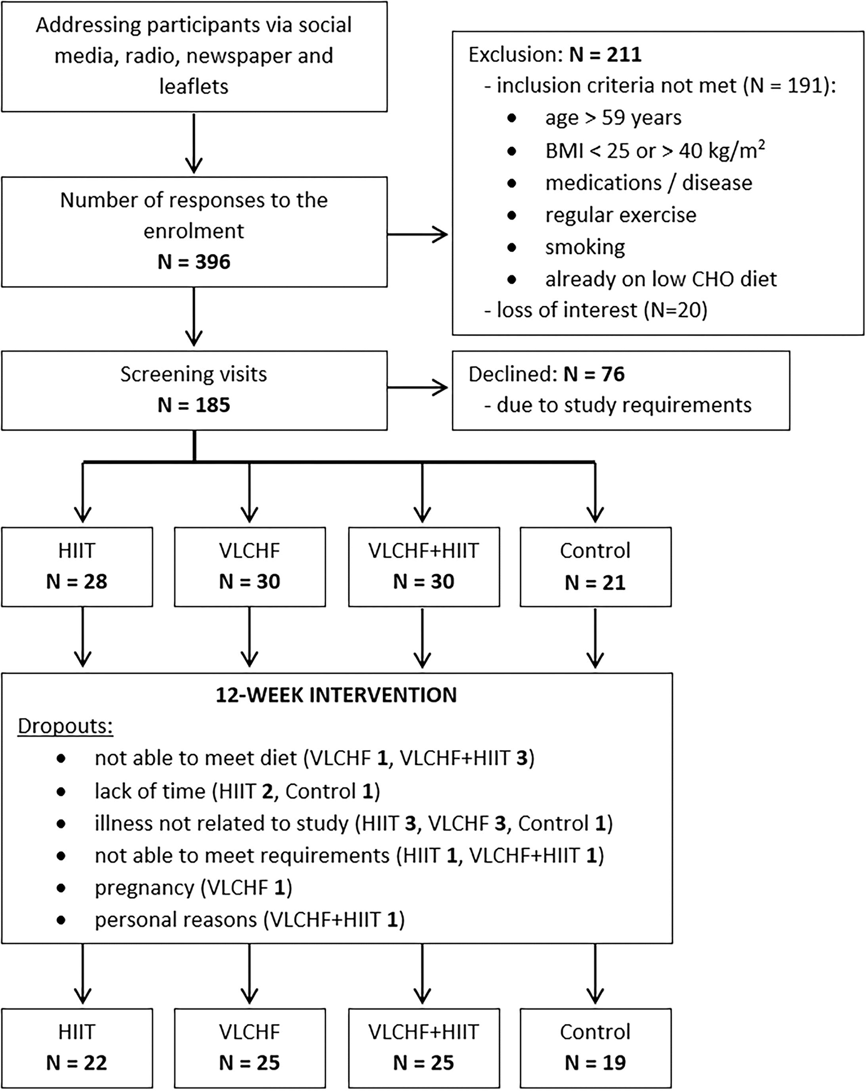 We enrolled adults aged 20–59 years with BMI 25.00–40.00 kg/m2, who were not engaged in any regular exercise. Participants with known chronic diseases were excluded. Additional eligibility criteria are listed in Supplementary Table 1. The participants had no previous experience with the VLCHF diet or HIIT. The recruitment details and dropouts during the study are shown in Figure 1. Written informed consent was obtained from all study participants. The study design was approved by the Ostrava university Ethics Committee (nr. 1/2018).