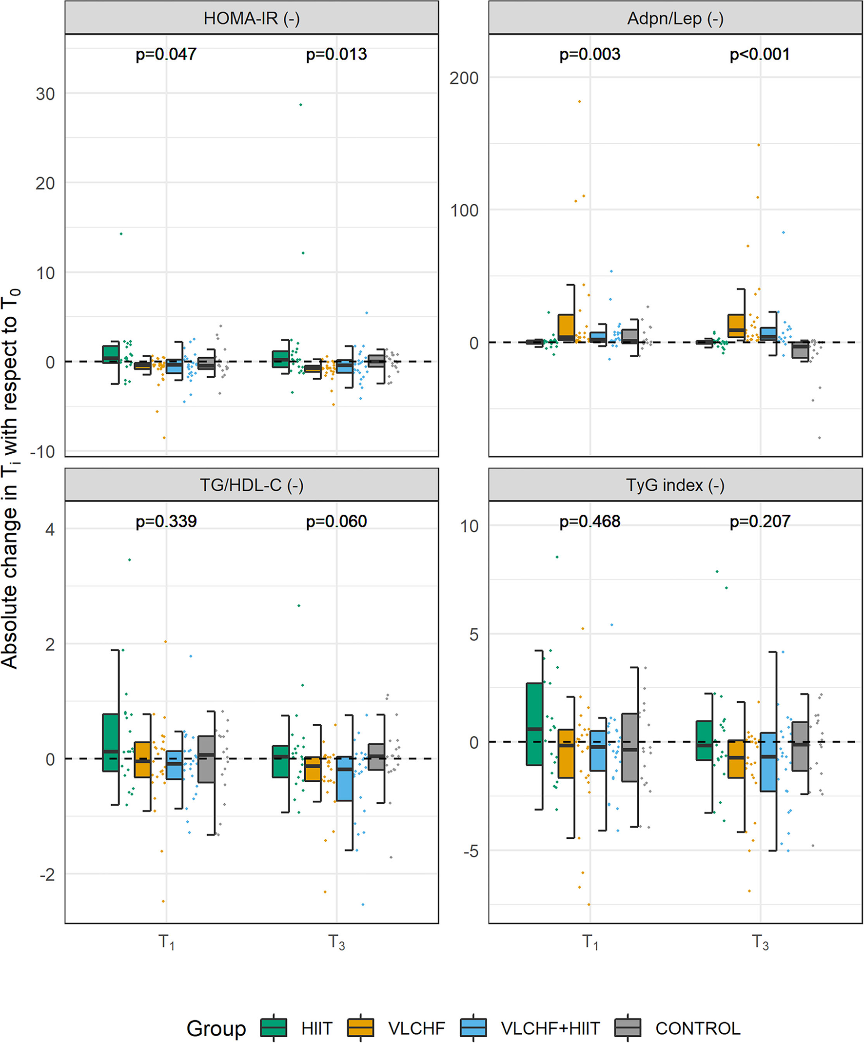 Figure 2. Absolute changes in HOMA-IR, Adpn/Lep ratio, TG/HDL-C ratio, and TyG index after 4 (T1) and 12 (T3) weeks.