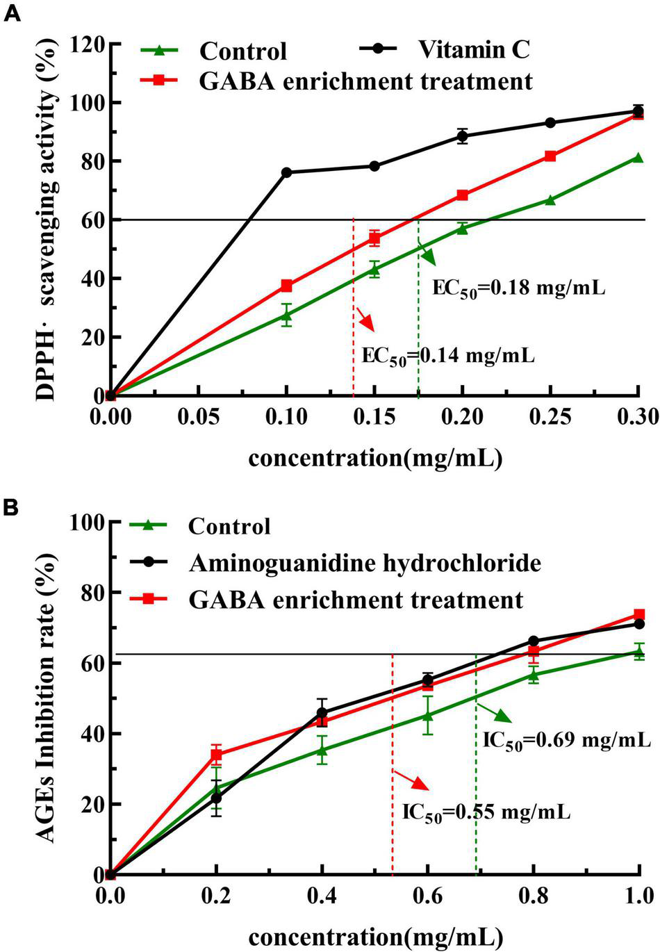 The mulberry leaves (“Yu711”) were collected from the National Mulberry Germplasm Resources in Zhenjiang, Jiangsu Province between March and April. γ-Aminobutyric acid (≥99%) was purchased from Sigma-Aldrich Co., Ltd. (St. Louis, MO, United States). Neochlorogenic acid, chlorogenic acid, cryptochlorogenic acid, catechin, vanillic acid, caffeic acid, syringic acid, rutin, hyperoside, and aminoguanidine hydrochloride (AG) were purchased from the Shanghai Yuanye Bio-Technology Co., Ltd. (Shanghai, China). 2,2-Diphenyl-1-picrylhydrazyl (DPPH) was purchased from TCI (Shanghai) Chemical Industry Development Co., Ltd. (Shanghai, China). Other reagent solutions were all purchased from Sinopharm Chemical Reagent Co., Ltd. (Shanghai, China).