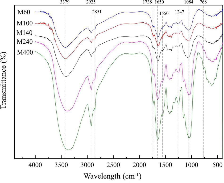 The GMLP of different particle sizes was analyzed by fourier transform infrared spectroscopy (FTIR) spectroscopy analysis (NICOLET-IS10 Spectrometer, Thermo Fisher Scientific, United States). Powder samples were prepared using the KBr pellet method. Spectra were recorded in the range of 4000 to 400 cm–1.