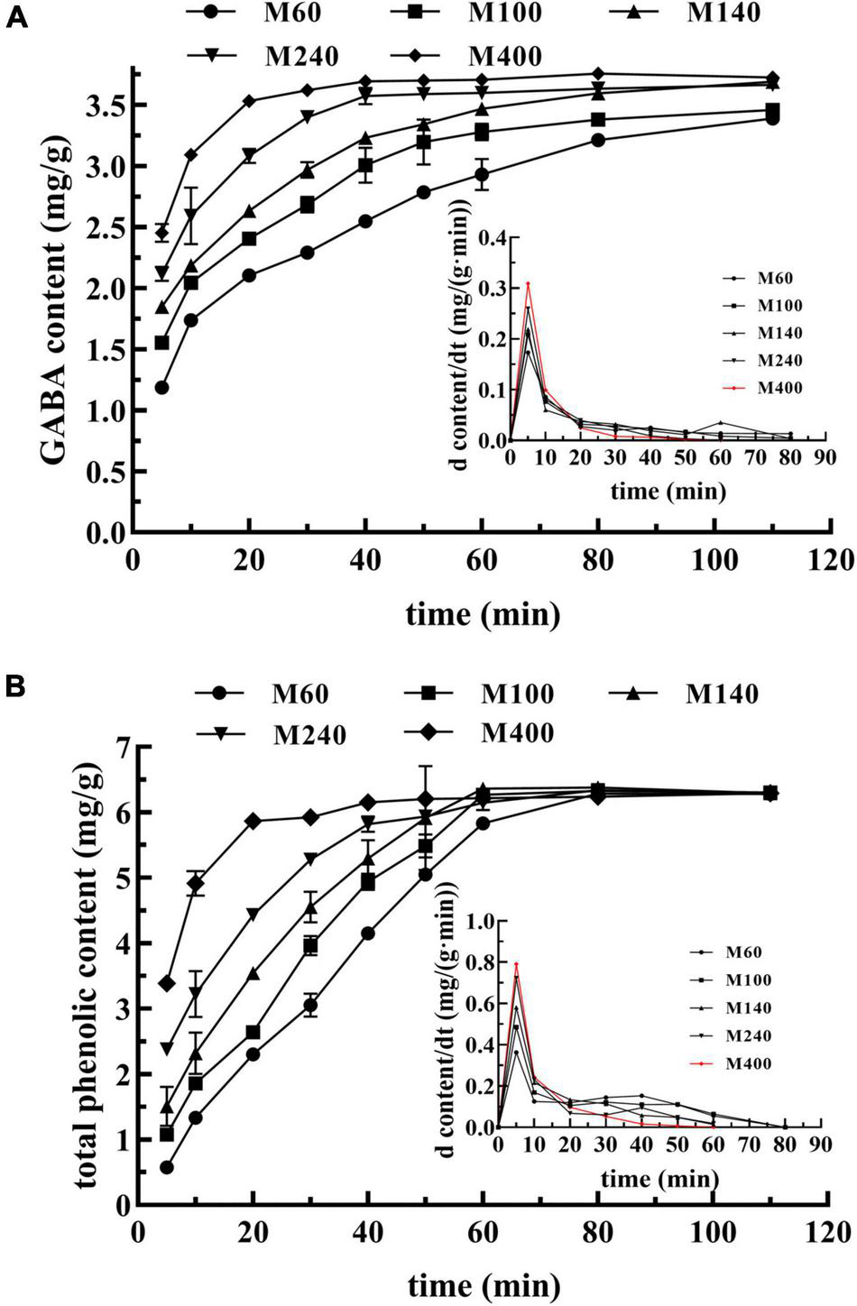 The extracts were obtained according to the traditional tea culture method. A total of 1.0 g of GMLP was mixed in 40 mL of distilled water (100 °C) and placed in a water bath at 40°C. The mixture was filtered with 0.45 μm films after 5, 10, 20, 30 40, 50, 60, 80, and 110 min, and the content of GABA and total phenolic (TPL) was measured according to the method in section GABA-enriched mulberry leaf water extracts (GMLE) preparation and component analysis.