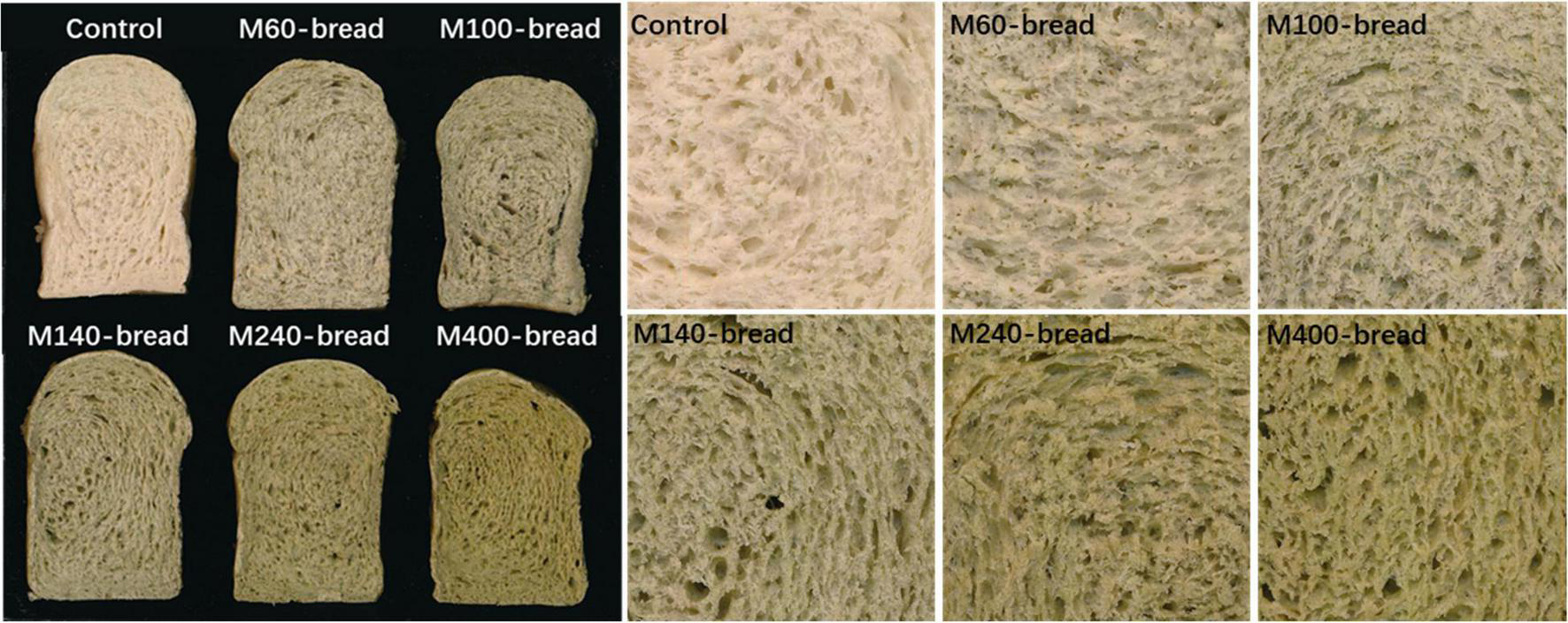 | Ingredients | Control | M60-bread | M100-bread | M140-bread | M240-bread | M400-bread |
