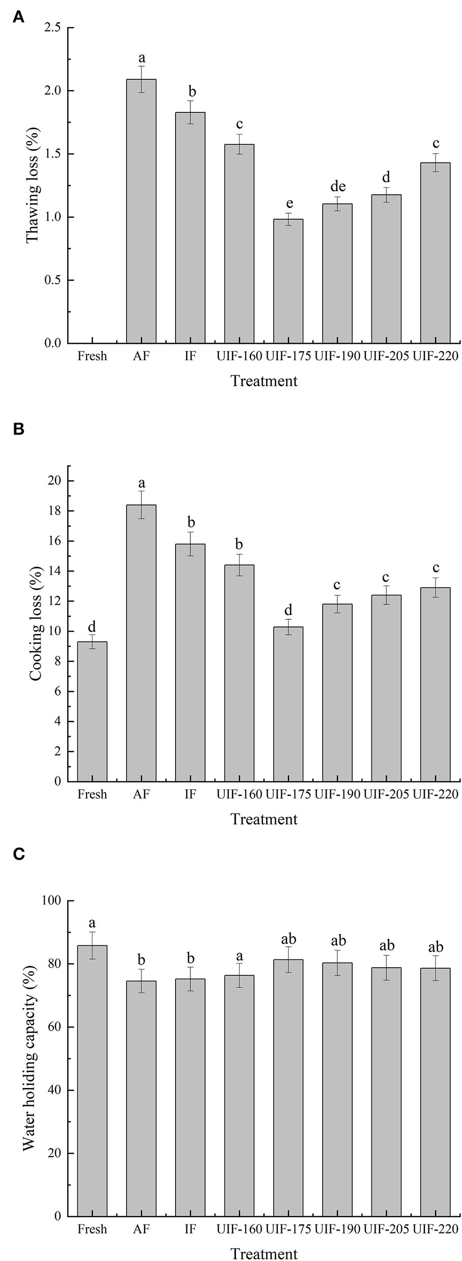 The sensory qualities of fish muscles are highly associated with WHC. The AF samples had the lowest WHC (74.56 ± 3.73%), as followed by the IF- and UIF-treated samples (Figure 3C). Especially, the UIF-175-treated samples had the highest WHC (81.33 ± 4.07%) and were comparable to the fresh samples with a WHC of 85.78 ± 4.29% (p > 0.05). In the current study, UIF's ability to increase WHC is due to its capacity to change or mechanically disrupt the native protein structure, exposing more active groups such as reactive sulfhydryl and hydrophobic groups, and the formation of small spaces with uniform structure between myofibrillar proteins, which can hold the water molecules firmly and reduce water loss when centrifuged (40).