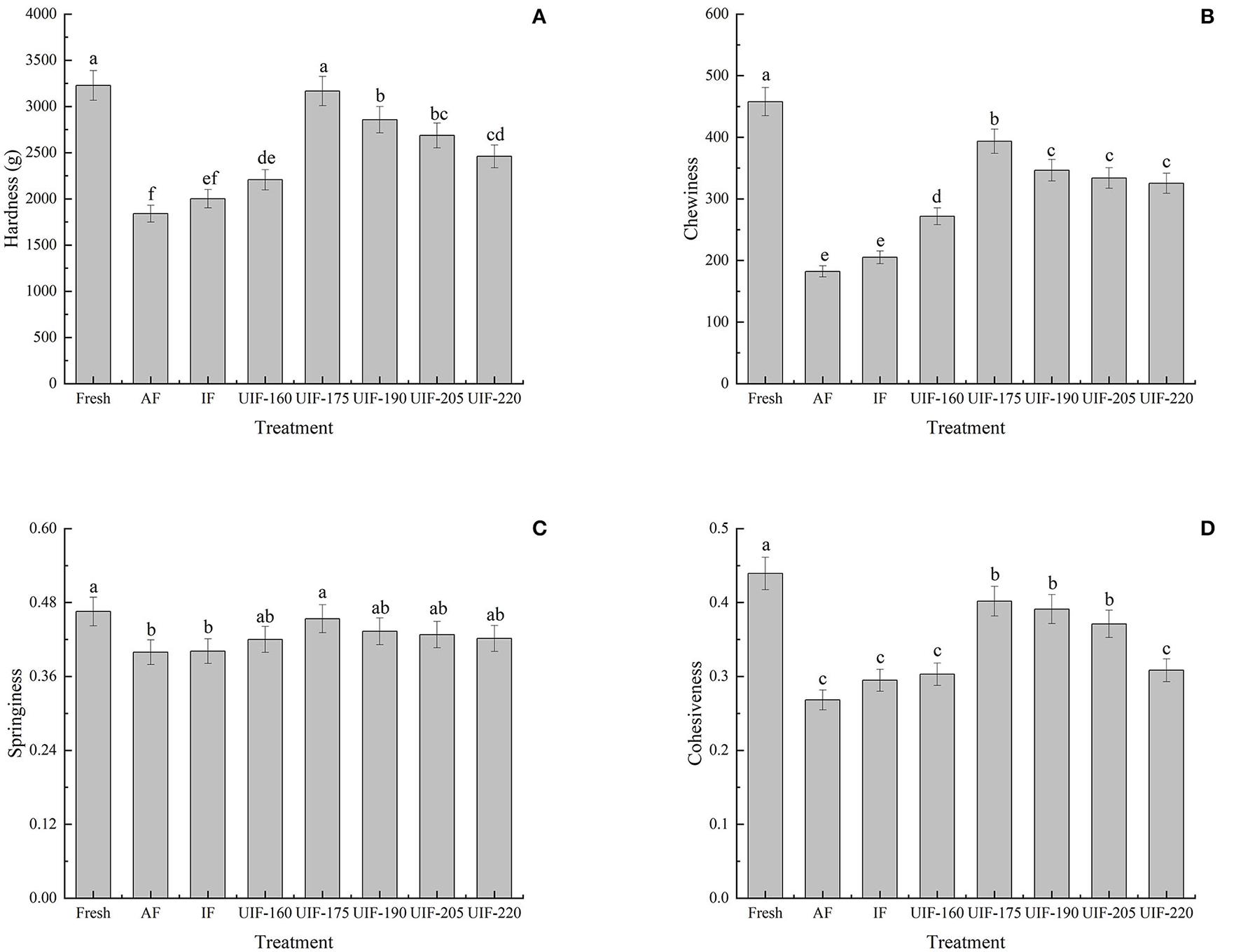 Influence of different freezing treatments on the hardness (A), chewiness (B), springiness (C), and cohesiveness (D) of the large yellow croaker. The results are average ± standard deviation (n = 3).