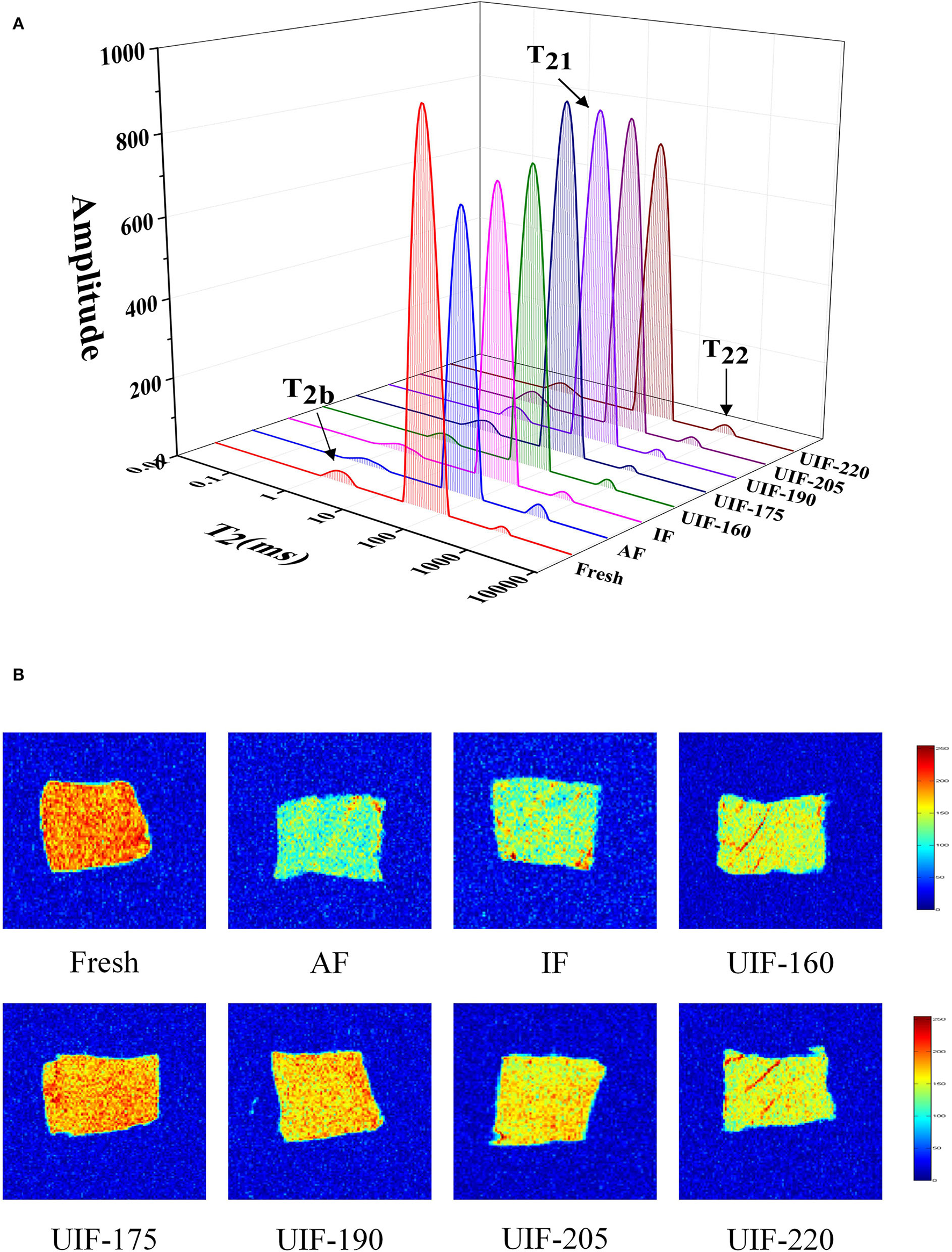 LF-NMR can be applied to evaluate the distribution and fluidity of moisture inside the frozen muscle under various freezing conditions. Three different water populations were identified by three peaks (Figure 6A). T2b (0–10 ms) denotes bound water, T21 (10–100 ms) represents immobilized water, and T22 (100–1,000 ms) represents free water (37).
