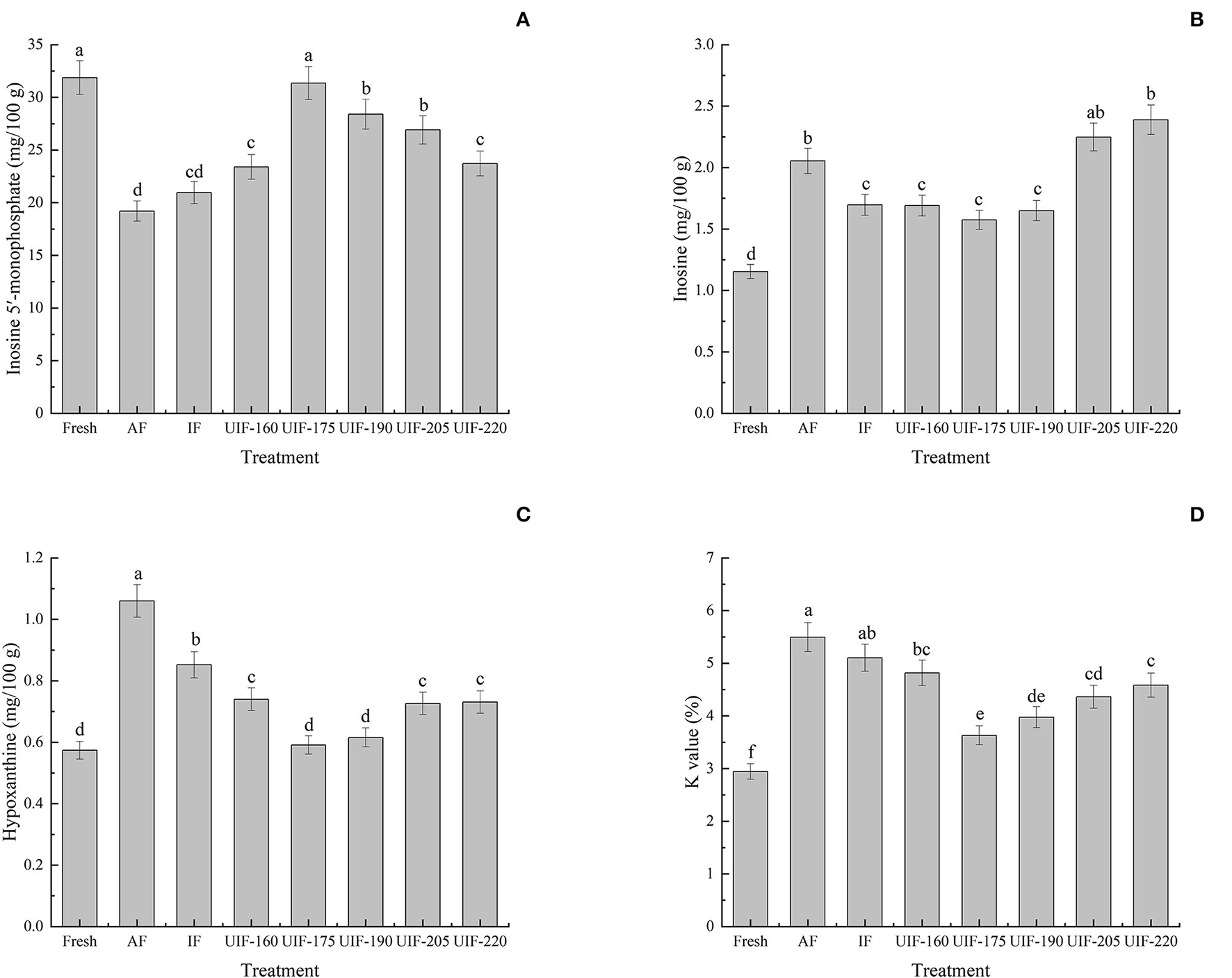 Influence of different freezing treatments on the inosine 5′-monophosphate (IMP) (A), inosine (HxR) (B), hypoxanthine (Hx) (C), and K values (D) of the large yellow croaker. The results are average ± standard deviation (n = 3).