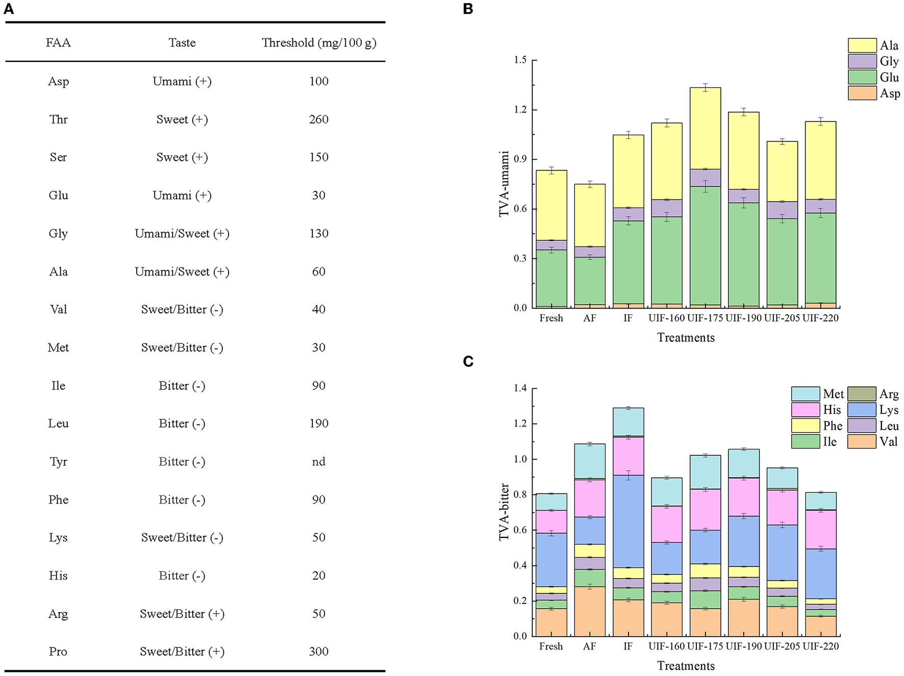 Free amino acids (FAAs) were determined using the method proposed by Li et al. (30). A 2 g of chopped large yellow croaker sample and 10 ml of 5% cold trichloroacetic acid were mixed and homogenized at 10,000 × g for 10 min. The extraction and centrifugation were repeated and the combined supernatants were diluted to 25 ml. The supernatant was filtered through a 0.22-μm filter. An automatic amino acid analyzer (Hitachi L-8800, Tokyo, Japan) was used for evaluation. The quantification of FAAs was accomplished automatically by the installed program according to the retention times and peak areas of FAAs standards (Sigma Chemical Co. St Louis, MO, United States). Three replicate measurements were carried out.