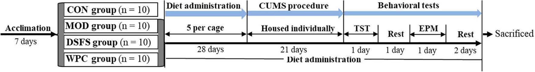 Schedule of the animal experiment. CUMS, chronic unpredictable mild stress; TST, tail suspension test; EPM, elevated plus maze test. CON, normal control group; MOD, model control group; DSFS, deoiled and dechlorogenic acid sunflower seeds group; WPC, whey protein group (n = 10 per group).