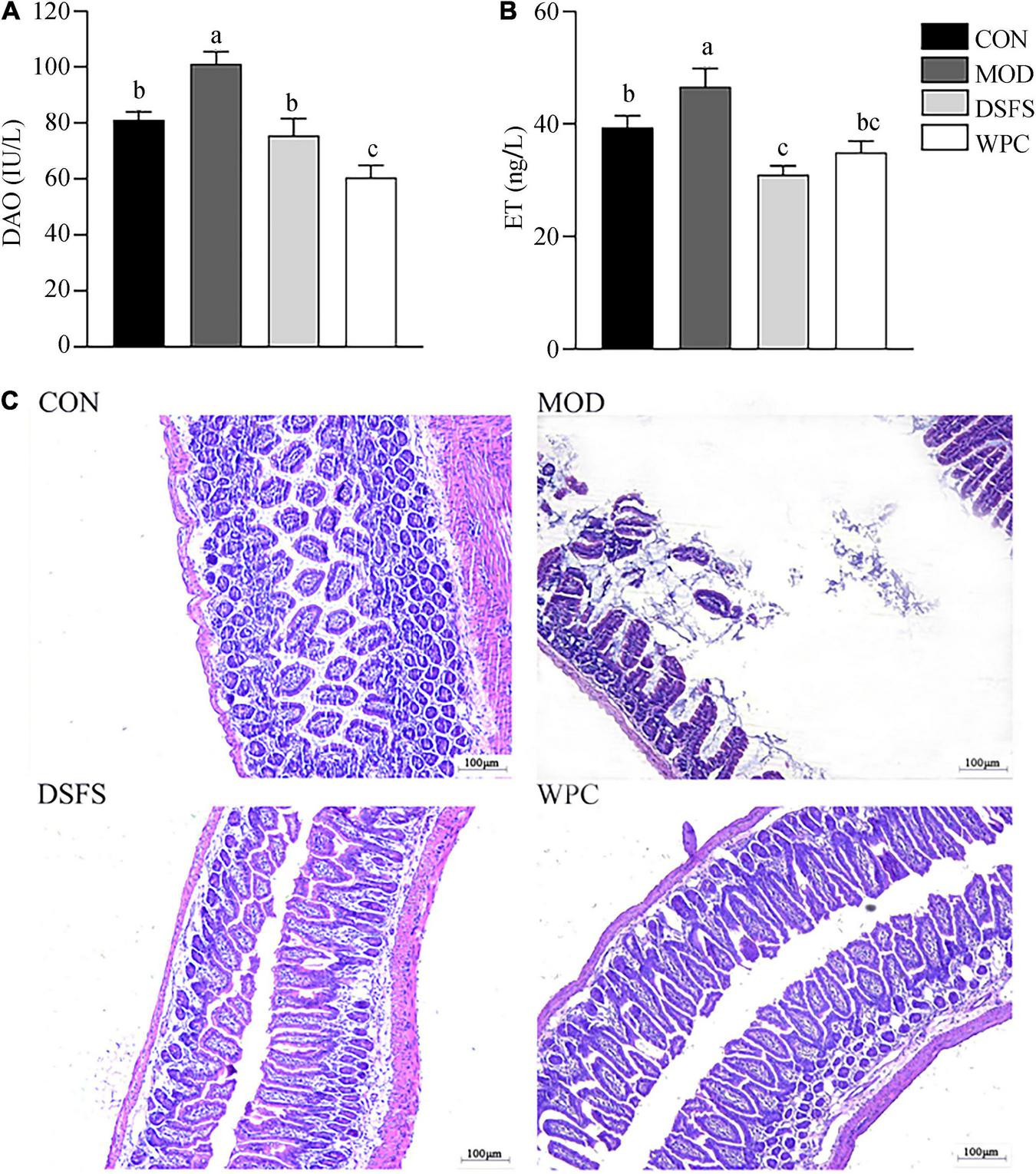 Effects of DSFS on plasma diamine oxidase (DAO) (A), endotoxin (ET) (B), and the histology of the ileum (C) in stressed mice. Data are expressed as mean ± SEM (n = 10 per group). The values with different superscript letters in a column are significantly different (P < 0.05). The letter is the same, indicating no significant difference. CON, normal control group; MOD, model control group; DSFS, deoiled and dechlorogenic acid sunflower seeds group; WPC, whey protein group.