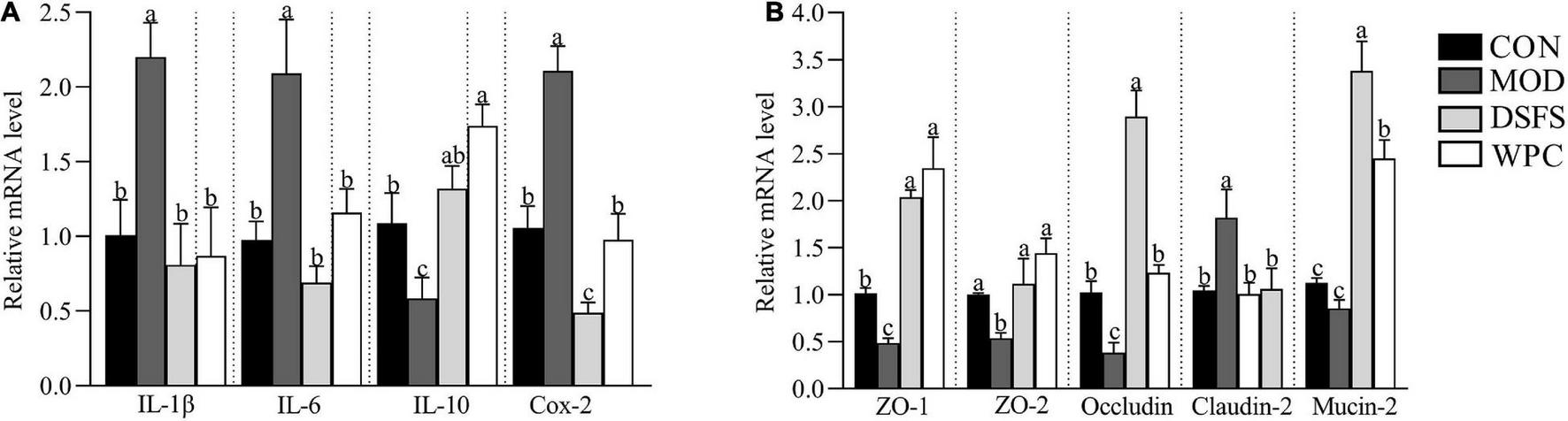 Effects of DSFS on the expression of inflammatory cytokines (A) and colonic tight junction proteins (B). Data are expressed as mean ± SEM (n = 10 per group). The values with different superscript letters in a column are significantly different (P < 0.05). The letter is the same, indicating no significant difference. CON, normal control group; MOD, model control group; DSFS, deoiled and dechlorogenic acid sunflower seeds group; WPC, whey protein group.