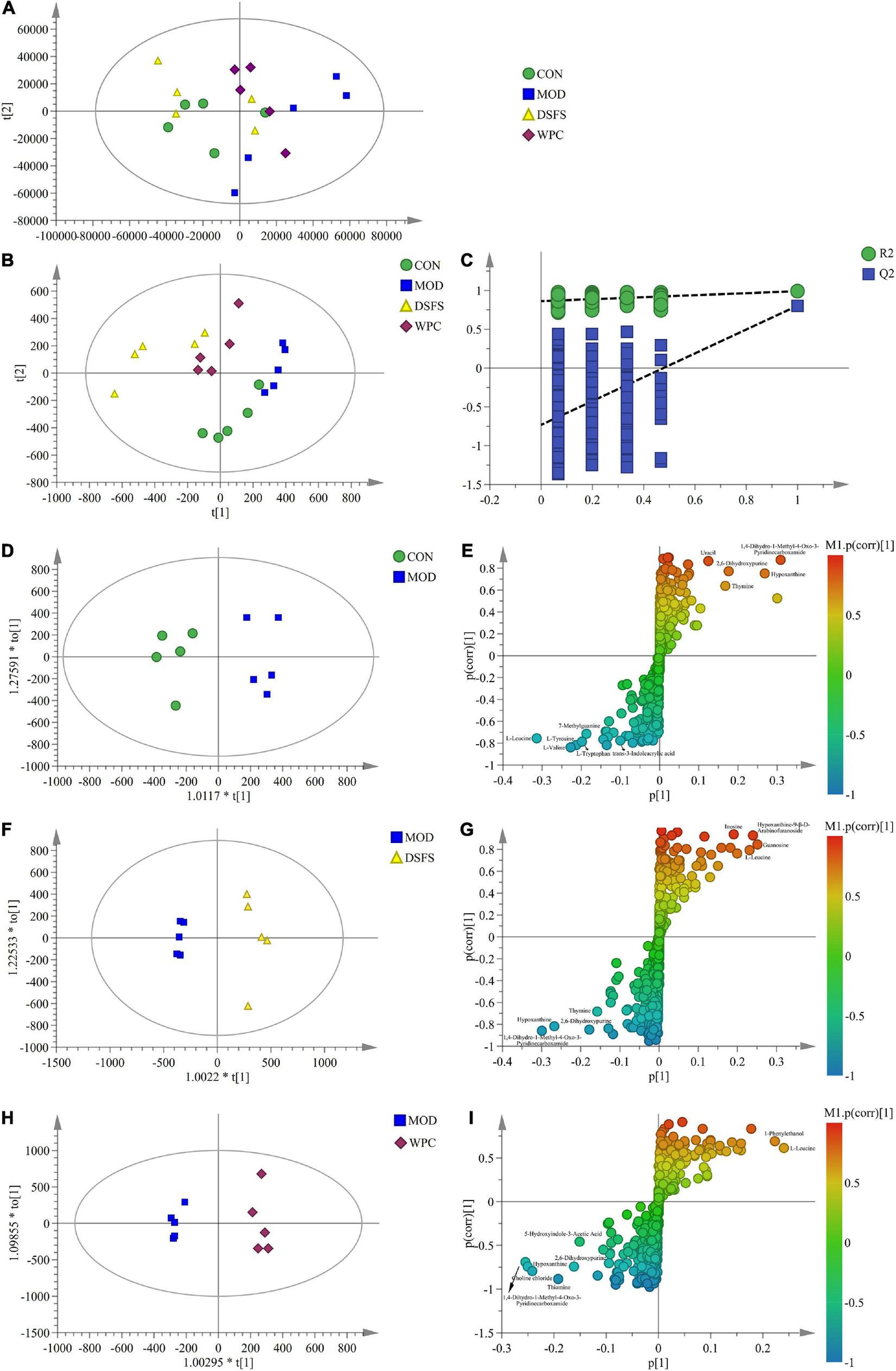 Extensive targeted metabolome and multivariate statistical analysis in colon content. (A) PCA plot (R2X = 0.925, Q2 = 0.507). (B) PLS-DA plot (R2X = 0.908, R2Y = 0.987, Q2 = 0.774). (C) PLS-DA validation plot. (D,F,H) OPLS-DA plot [(D): R2X = 0.691, R2Y = 0.932, Q2 = 0.572, (F): R2X = 0.558, R2Y = 0.974, Q2 = 0.878, (H): R2X = 0.532, R2Y = 0.985, Q2 = 0.713]. (E,G,I) S-plot (n = 5 per group). CON, normal control group; MOD, model control group; DSFS, deoiled and dechlorogenic acid sunflower seeds group; WPC, whey protein group.