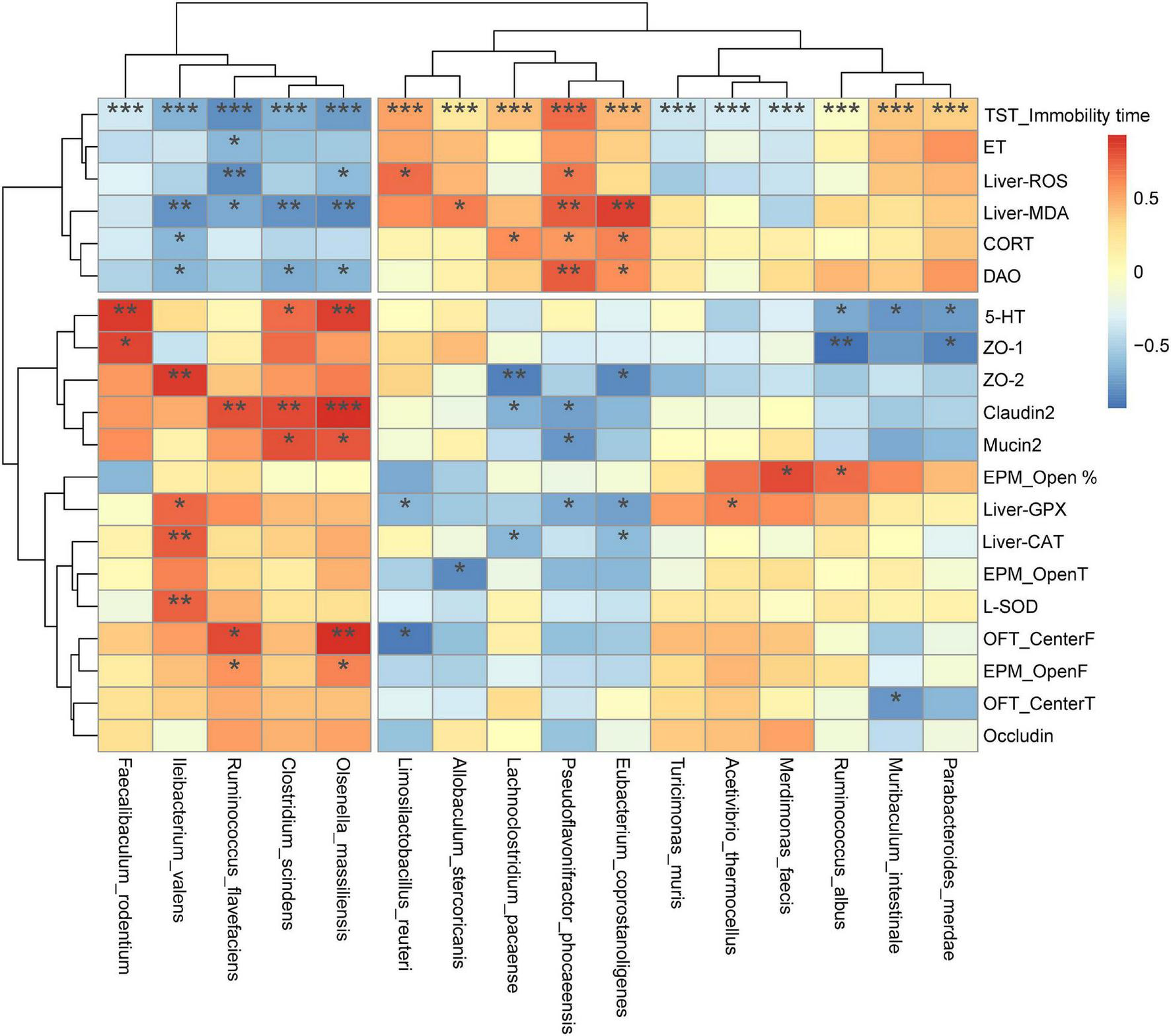As shown in Figure 8G, CUMS significantly increased the relative contents of intestinal Pseudoflavonifractor phocaeensis (P < 0.05) and Eubacteium coprostanoligenes (P < 0.01), while the DSFS and WPC-treated groups significantly decreased relative to the MOD group (FDR < 0.05). Limosilactobacillus reuteri was significantly up-regulated (P < 0.05) in the MOD group, and relatively down-regulated (P < 0.05) in the DSFS-treated group. CUMS caused a significant down-regulation of intestinal I. valens (P < 0.05), which was significantly up-regulated in DSFS and WPC-treated mice relative to MOD mice (P < 0.05). Meanwhile, both treatments significantly up-regulated Olsenella massiliensis and down-regulated the relative content of Parabacteroides merdae (P < 0.05). DSFS treatment also specifically up-regulated the relative content of Clostridium massiliensis, Turicimonas muris and Merdimonas faecis (P < 0.05).