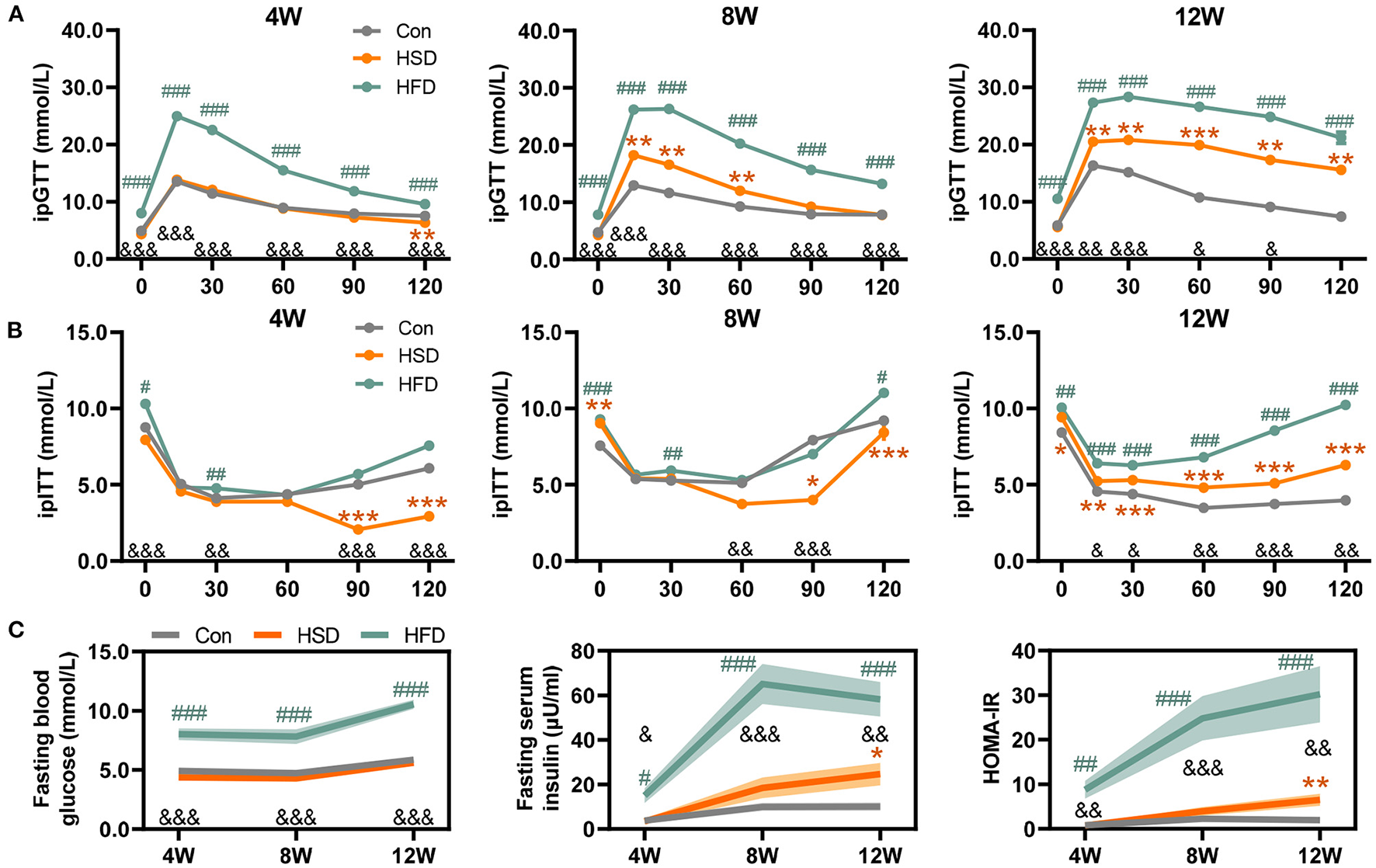 High-fat or high-sugar diet-induced the impaired glucose tolerance in mice. (A) Glucose tolerance test (GTT) was performed at 1 week before 3 time points (mmol/L). (B) Insulin tolerance test (ITT) was performed 3–4 days after each GTT test (mmol/L). (C) Fasting blood glucose level (mmol/L), fasting serum insulin level (μU/ml), and HOMA-IR (fasting blood glucose level * fasting serum insulin level / 22.5). Data are represented as the mean ± SEM. n = 7-15; *p < 0.05, **p < 0.01, ***p < 0.001 (HSD vs. Con); #p < 0.05, ##p < 0.01, ###p < 0.001 (HFD vs. Con); &p < 0.05, &&p < 0.01, &&&p < 0.001 (HFD vs. HSD).