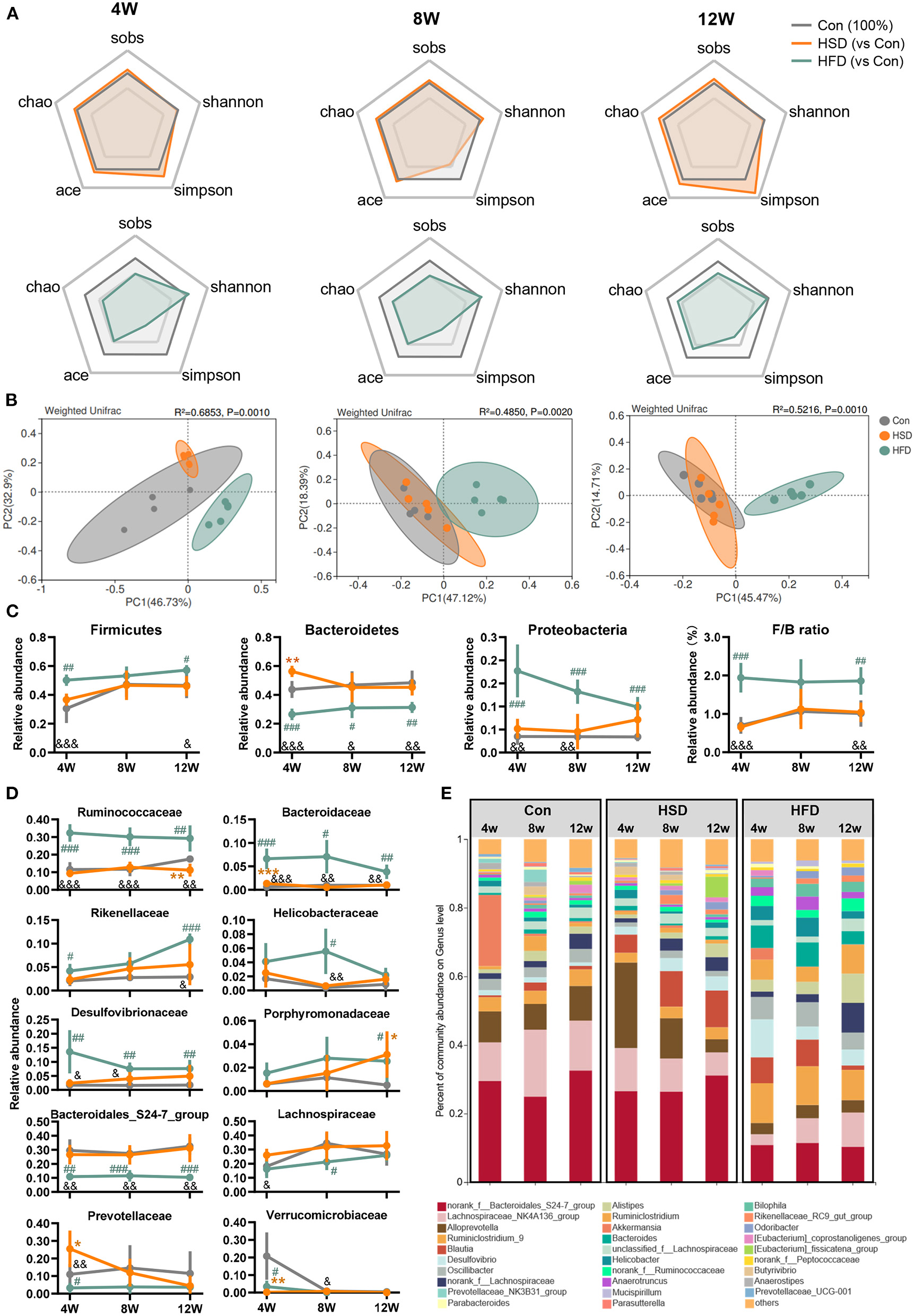 High-fat diet, but not high-sucrose intake resulted in dramatic alteration of gut microbiome. Fecal samples of Con, HSD, and HFD groups at three time points were analyzed with 16S rRNA gene sequencing. (A) The relative change in α diversity index, including Sobs, Chao, Ace, Simpson, and Shannon index, normalized with Con group (100%). (B) Weighted UniFrac based PCoA analysis among groups with permutational multivariate analysis of variance (PERMANOVA). (C) Relative abundance of bacteria at phylum level and Firmicutes/Bacteroidetes (F/B) ratio. (D) Relative abundance of top 10 abundant family. (E) Bacterial taxonomic profiling at genus level. Data are represented as the mean ± SEM. n = 4-5; *p < 0.05, **p < 0.01, ***p < 0.001 (HSD vs. Con); #p < 0.05, ##p < 0.01, ###p < 0.001 (HFD vs. Con); &p < 0.05, &&p < 0.01, &&&p < 0.001 (HFD vs. HSD).