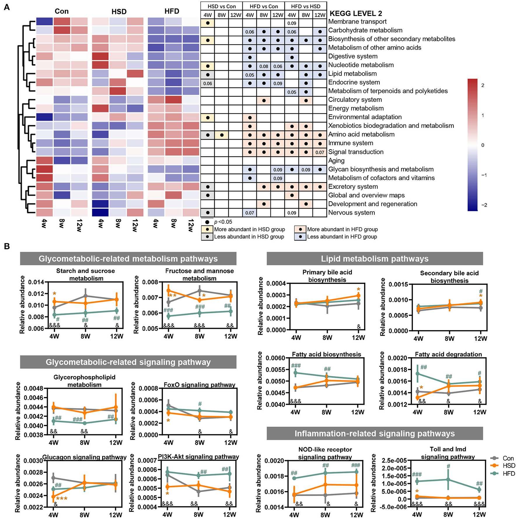High-fat diet changed the main functions of gut dysbiosis in mice. Microbial functions regulated by HFD or HSD were predicted with PICRUSt2. (A) Heatmap summarizing the changes in gut microbial community function at KEGG level 2, following Con, HSD, and HFD group at three time point in mice. Black circle represents the KEGG pathway which was significantly altered relative to Con or HSD groups at same time point (p < 0.05). (B) Relative abundance of the pathways related to glycolipid metabolism disorder. Data are represented as the mean ± SEM. n = 4-5; *p < 0.05, **p < 0.01, ***p < 0.001 (HSD vs. Con); #p < 0.05, ##p < 0.01, ###p < 0.001 (HFD vs. Con); &p < 0.05, &&p < 0.01, &&&p < 0.001 (HFD vs. HSD).