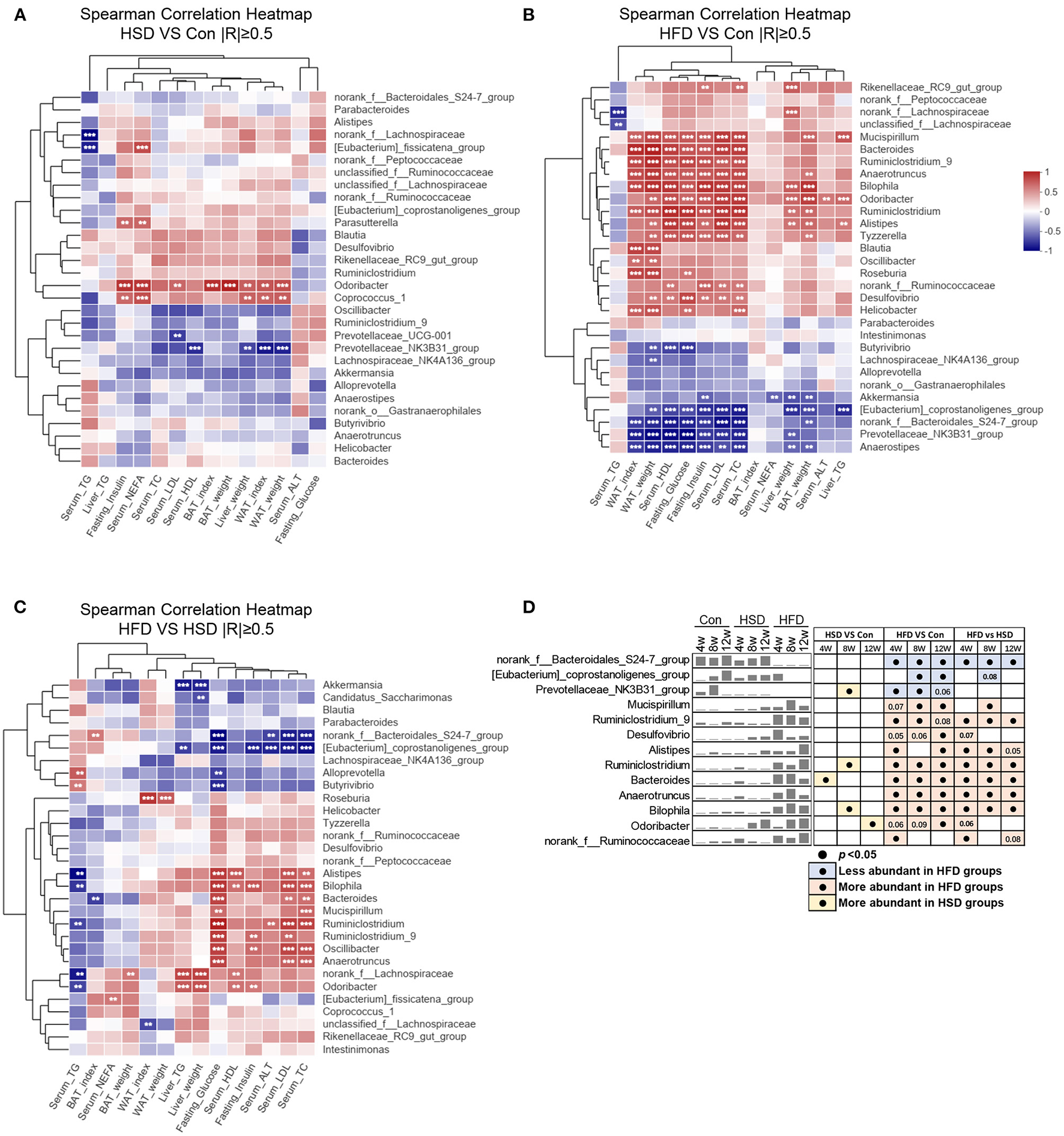 Diet-dependent specific correlation between mouse phenotypes and gut microbiota. Spearman's correlation analysis (|R| ≥ 0.5) between the top 30 abundance genera and metabolic disorder traits (including liver weight, WAT weight, WAT index, BAT weight, BAT index, serum HDL, serum LDL, serum TC, serum TG, serum NEFA, liver TG, serum ALT, fasting glucose, and fasting insulin) among three groups, by a pairwise comparisons, including HSD vs. Con (A), HFD vs. Con (B), and HFD vs. HSD (C). **p < 0.01, ***p < 0.001. (D) Mean abundance variation and statistical results of several high phenotypic correlations genus among groups at all-time points. Black circle represents p < 0.05.