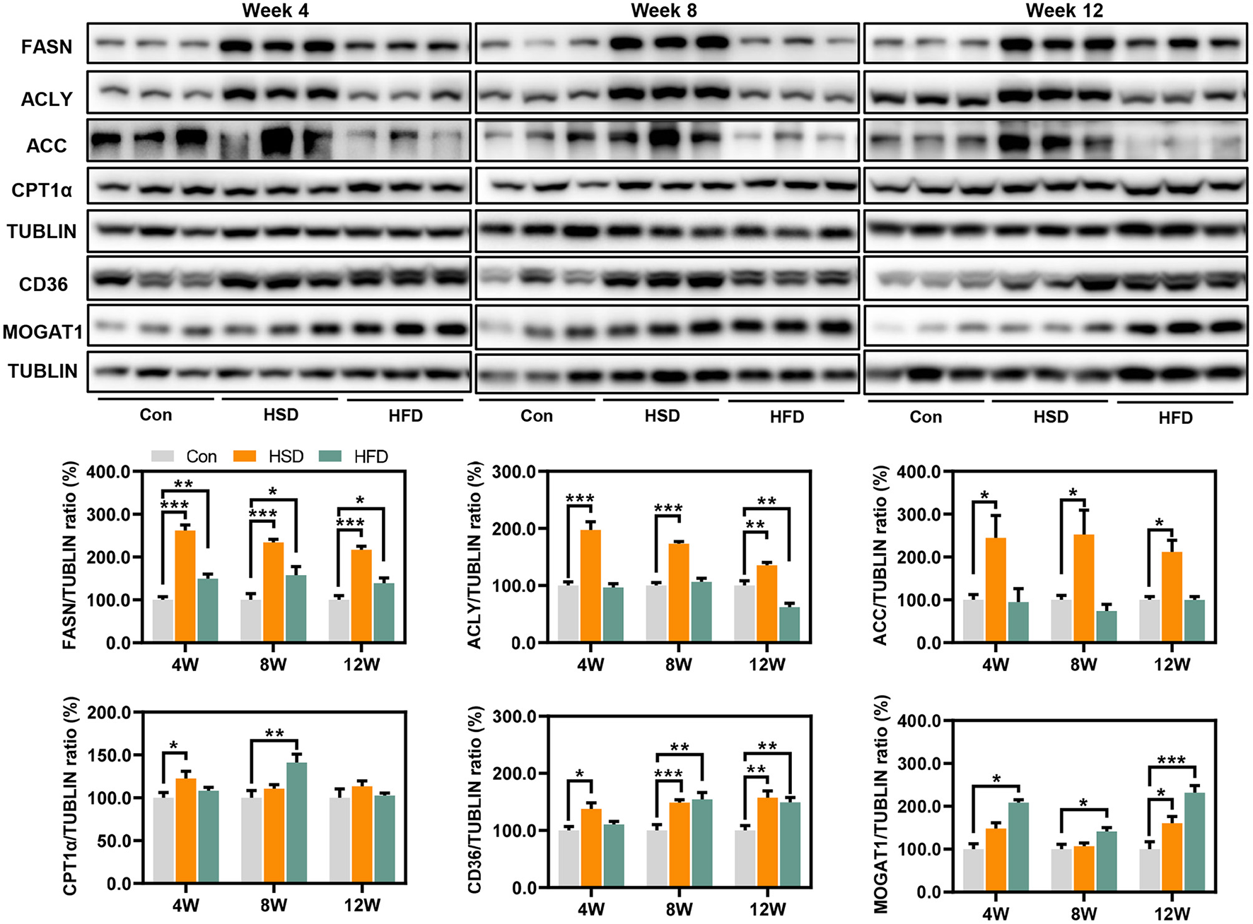 Expression of protein related to hepatic de novo synthesis and metabolism of fatty acid, including FASN, ACLY, ACC, CPT1α, CD36, and MOGAT1 (%). *p < 0.05, **p < 0.01, ***p < 0.001.