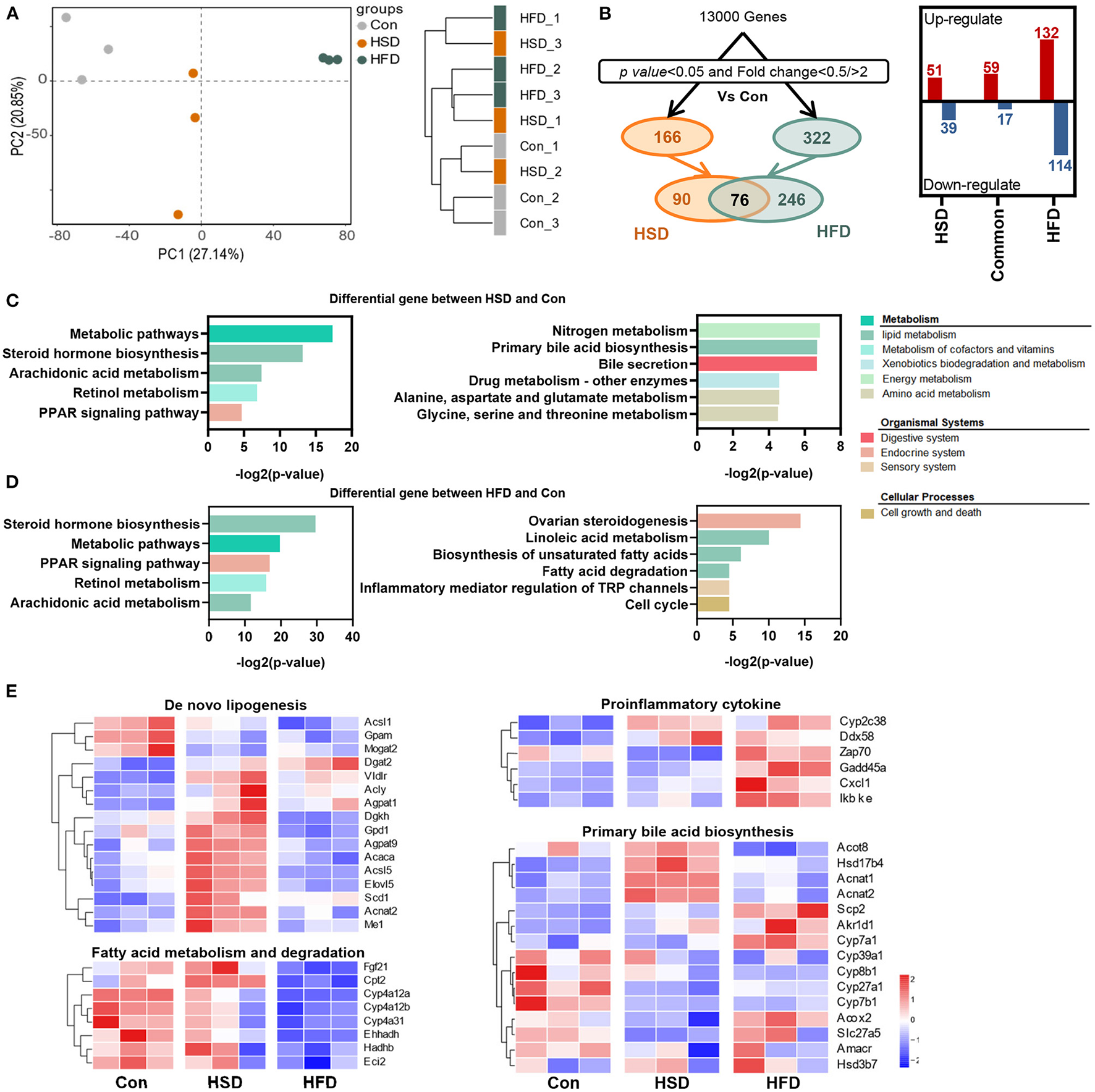 High-fat diet and high-sucrose intake differently altered the hepatic transcriptomic profile. RNA-seq was performed on liver tissues in mice fed with Con, HSD, and HFD for 12 weeks. (A) Principal component analysis (PCA) and sample clustering tree among groups. (B) Experimental strategy of the genetic screenings. (C) KEGG pathway enrichment analysis on the differential gene between HSD and Con. (D) KEGG pathway enrichment analysis on the differential gene between HFD and Con. Common pathways were shown on the left, and uniport pathways were shown on the right, in plot D and E. (E) Heatmap of genes from lipid metabolism pathway.