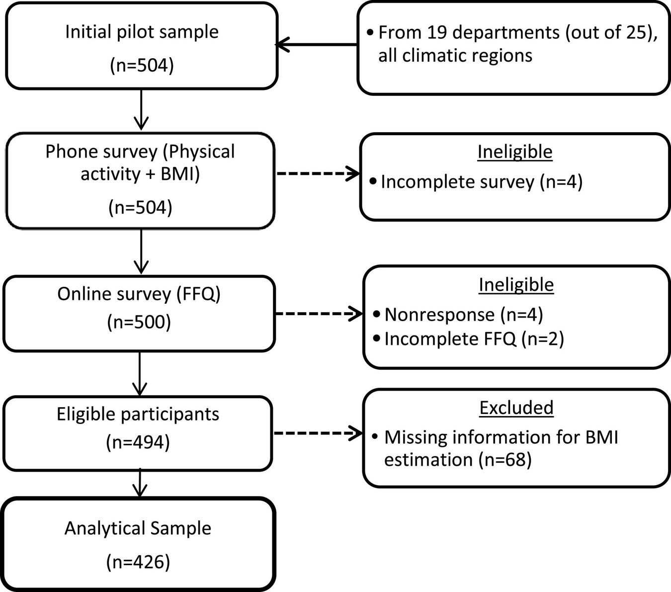 We analyzed data of 504 participants of the pilot study that was conducted in July 2021 to validate the online FFQ to be used as a dietary intake instrument for further YLS data collections. A convenience sample with similar characteristics as the ones from the YLS’s younger cohort (including the region of residence, aged 18–27 years, and a balanced distribution of sex) was invited to participate in the pilot study. For practical reasons, only participants with access to the internet and a computer or smartphone were invited to participate. Pregnant or breastfeeding women were excluded. Of the total sample, we excluded 78 participants for not responding or providing incomplete data either in the online FFQ and/or for height/weight measures, resulting in 426 participants (Figure 1). As part of the pilot study, participants were interviewed by phone and asked to self-report their weight and height, sociodemographic characteristics, and physical activity. After that, they were invited to complete an online survey via which the FFQ was administered.