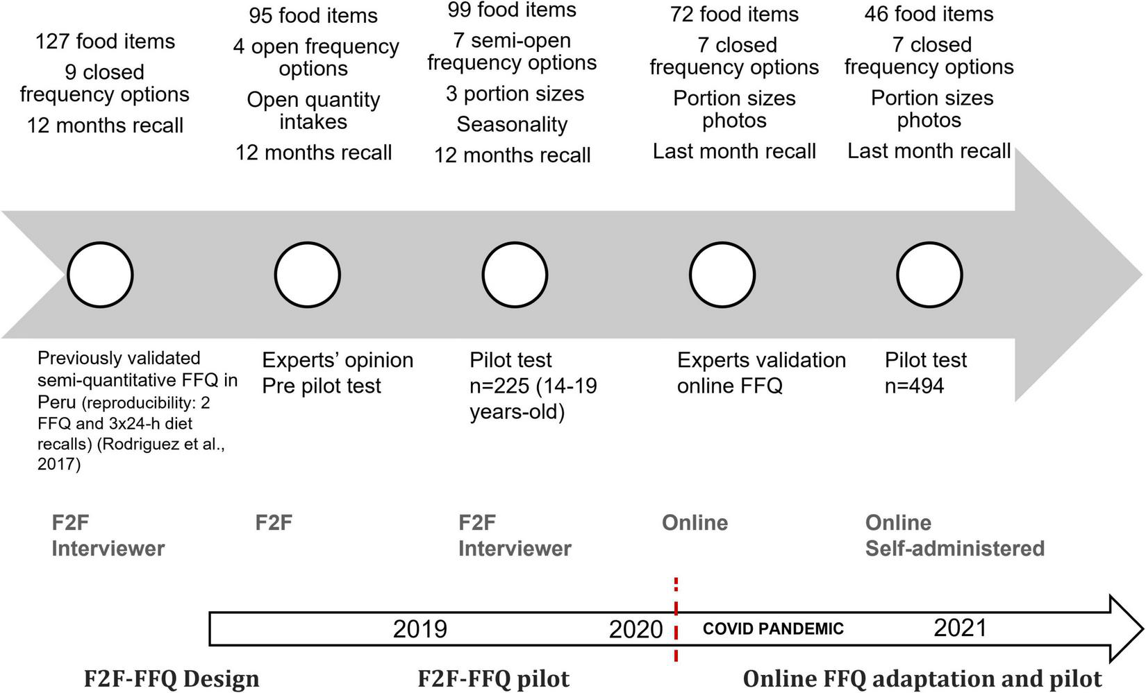 Hence, this study aims to describe the multi-stage process used to adapt a previously validated face-to-face FFQ of an online self-administered FFQ for young adults in Peru during the pandemic, including the selection of the food items, portion sizes, and food frequency response options. Furthermore, it aims at validating the FFQ by estimating the proportion and characteristics of misreporting of EI in this population and assessing the internal reliability of the online FFQ using Cronbach’s alpha test. Findings from this study are expected to inform the measurement of usual dietary intake in the YLS cohort in Peru. In addition, the tool designed can be a good alternative to develop nutritional studies with large coverage at a low cost in the context of developing countries.