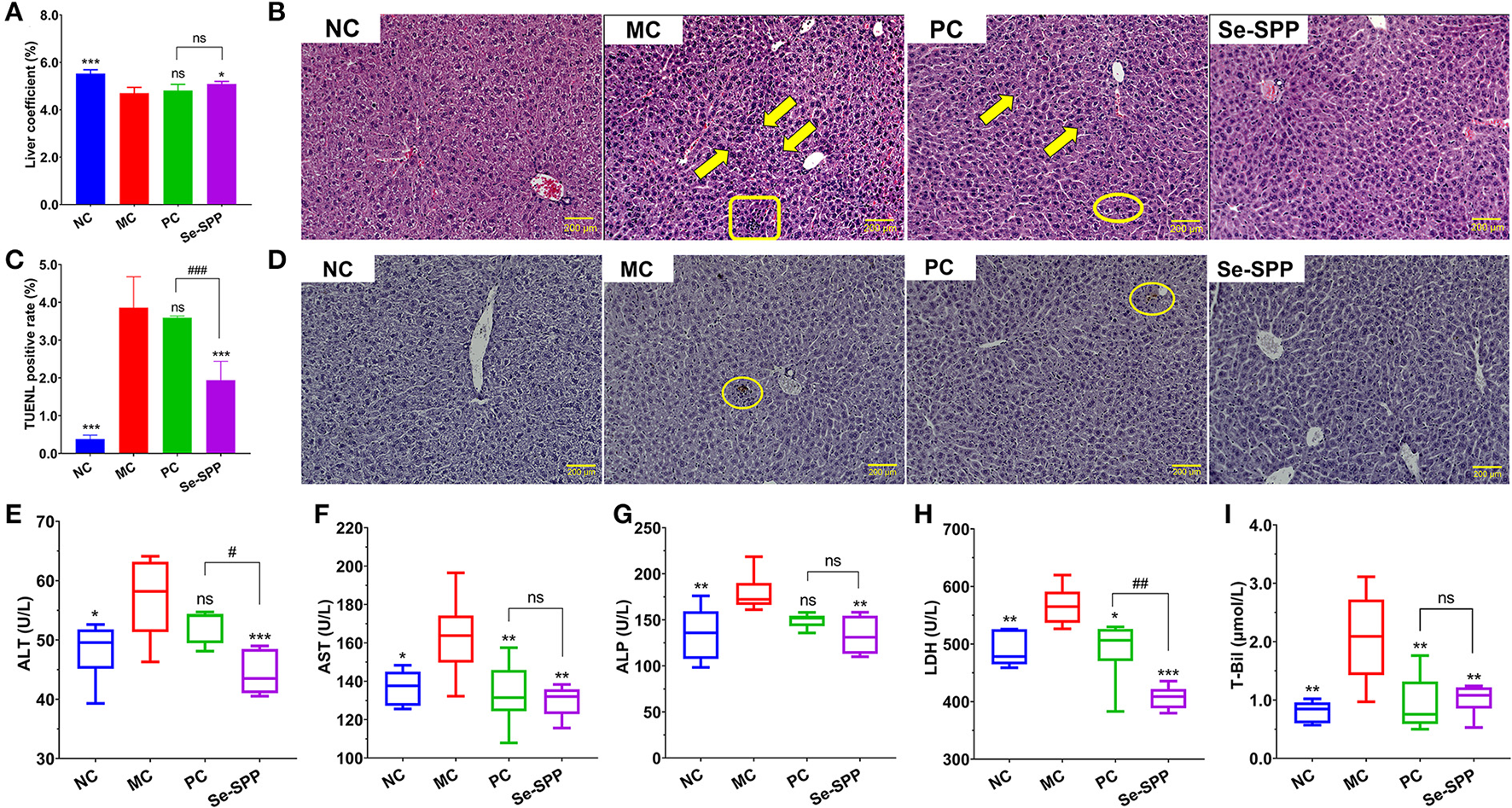 Se-SPP alleviates Cd-induced liver injury in mice. Liver coefficient (A). Images of H&E-stained liver [(B), 20×], karyopyknosis (arrow), punctate necrosis (circle), and inflammatory cell infiltration (rectangle). The TUNEL staining of hepatic cells (C,D) and serum T-Bil, ALT, AST, ALP, and LDH levels (E–I). ALT, alanine transaminase; AST, aspartate aminotransferase; ALP, alkaline phosphatase; LDH, lactate dehydrogenase; T-Bil, total bilirubin; NC, normal control; MC, model control; PC, positive control; Se-SPP, selenium-containing polysaccharides from Spirulina platensis. Data are expressed as mean ± SEM (n = 6). Graph bars marked with ns: not significant, *p < 0.05, **p < 0.01, ***p < 0.001, when comparing with MC, #p < 0.05, ##p < 0.01, ###p < 0.001 when comparing PC with Se-SPP.