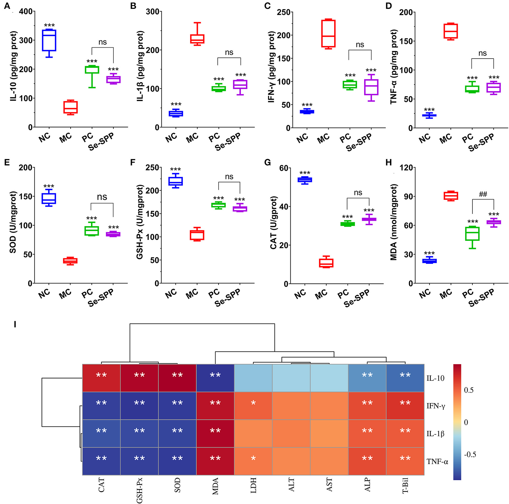 Se-SPP alleviates Cd-induced liver inflammation in mice. Liver TNF-α, IL-1β, IFN-γ, and IL-10 levels (A–D); liver GSH-Px, SOD, CAT, and MDA levels (E–H); and correlation analysis between the inflammatory-related factors and antioxidant indexes (I). NC, normal control; MC, model control; PC, positive control; Se-SPP, selenium-containing polysaccharides from Spirulina platensis. TNF-α, tumor necrosis factor; IL-1β, interleukin-1 beta; IFN-γ, interferon-γ; IL-10, interleukin-10; GSH-Px, glutathione peroxidase; SOD, superoxide dismutase; CAT, catalase; MDA, malondialdehyde. Data are expressed as mean ± SEM (n = 6). Graph bars marked with ns: not significant,*p < 0.05, **p < 0.01, ***p < 0.001 when compared with MC; #p < 0.05, ##p < 0.01, ###p < 0.001 when comparing PC with Se-SPP. The colors range from red (positive correlation) to dark blue (negative correlation), and significant correlations are marked with *p < 0.05, **p < 0.01, ***p < 0.001.