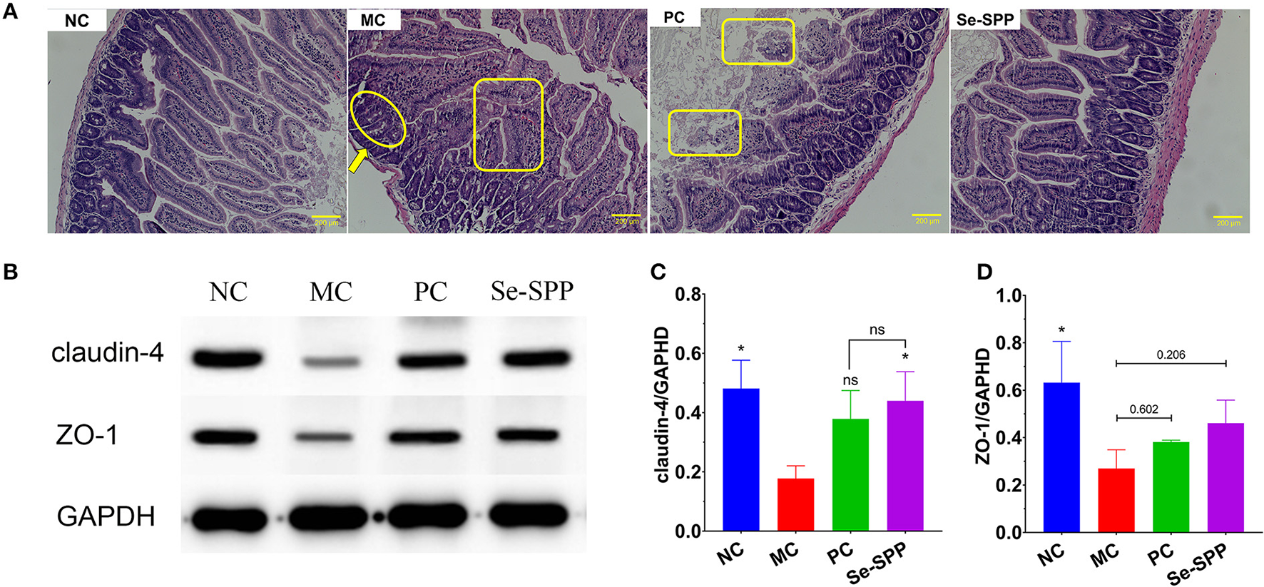 The tight junctions (TJs) between epithelial cells are the major components of the intestinal barrier. In order to investigate whether the disruption of the intestinal barrier in Cd toxic mice was restored by Se-SPP, the expressions of two major tight junction proteins (claudin-4 and ZO-1) were determined using Western blot analysis. As shown in Figures 3B–D, claudin-4 and ZO-1 expressions of the jejunum tissues in the MC group were apparently decreased compared to those in the NC group. Se-SPP treatment led to an upregulation of the expression of claudin-4 and ZO-1, which was better than that in the PC group.