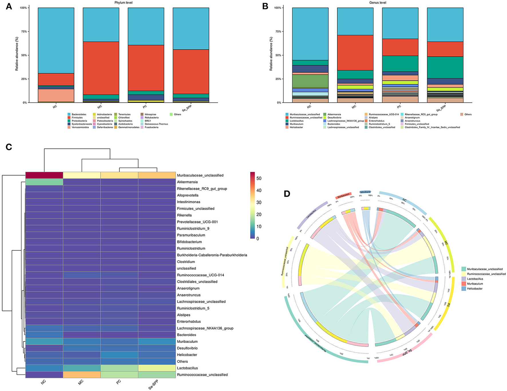 R software was used for cluster analysis of the 30 most abundant genera and draw the heatmap, and the colors were used to reflect the similarity of community composition between groups. A clustering heatmap (Figure 4C) showed an obvious difference in microbiological composition between the normal and Cd-treated mice, and the supplementation of CdCl2 altered the microbial composition of the Cd-treated mice. The abundance of Muribaculaceae decreased dramatically in the MC group, but its abundance increased after treatment with Na2SeO3 and Se-SPP. The result of relative abundance of Ruminococcaceae was opposite. Consistently, the figure of Circos was comparable to that of the aforementioned (Figure 4D).