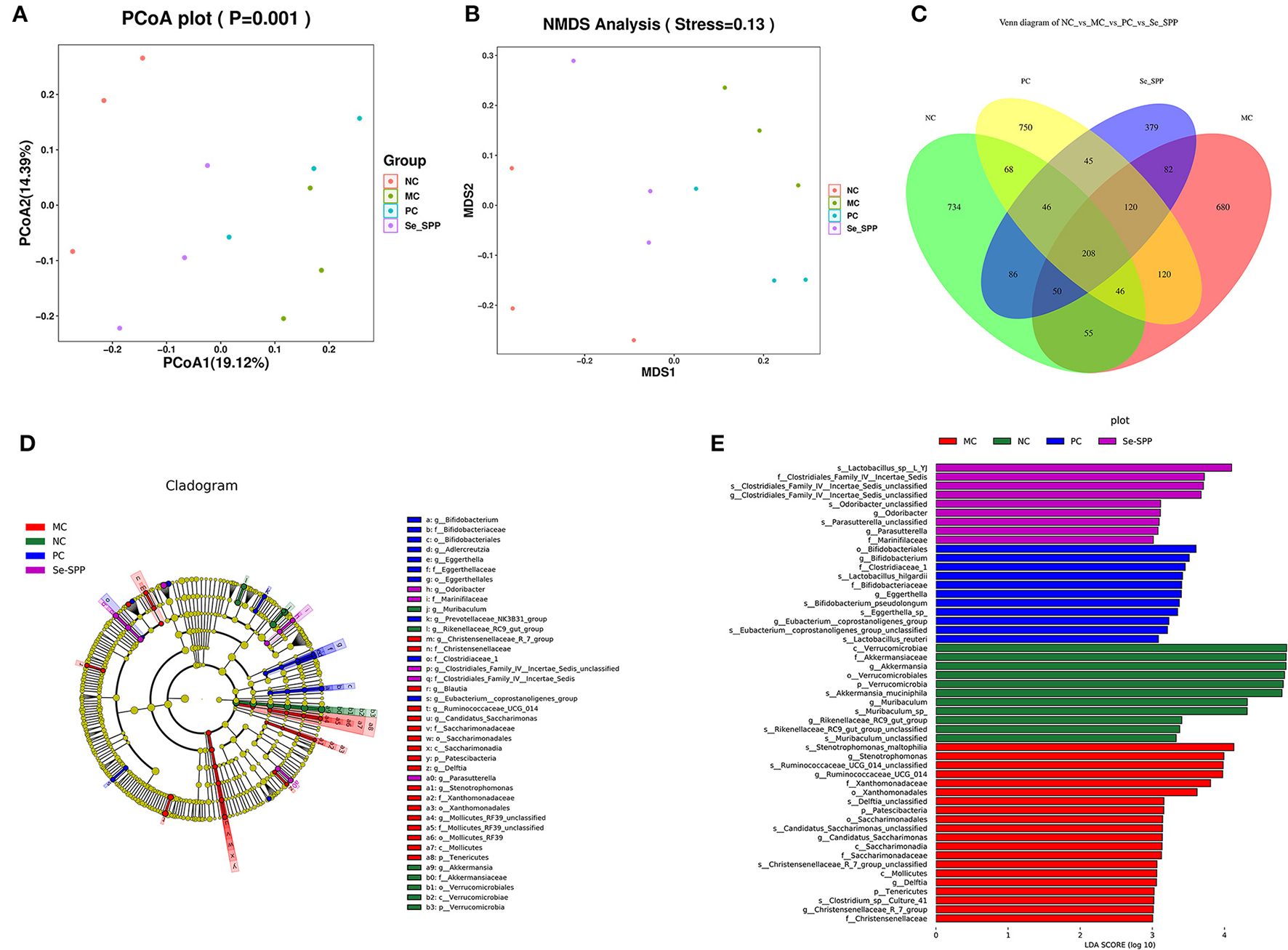 Se-SPP modulates the specific phylotypes of the gut microbiome. β-Diversity representing PCoA and NMDS (A,B), Venn diagram of OTUs (C), and cladogram. From the inside out was the bacterial taxonomic level of phylum, class, order, family, and genus (D), indicator bacteria of intestinal microbiota with LDA scores of 3 or greater in mice (E). NC, normal control; MC, model control; PC, positive control; Se-SPP, selenium-containing polysaccharides from Spirulina platensis. Data are expressed as mean ± SEM (n = 3).