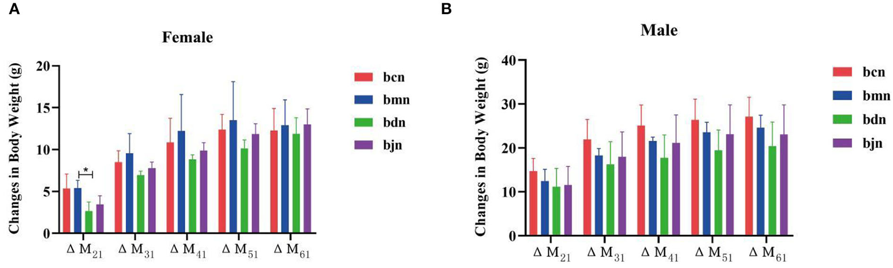 During the experiment, all mice had a normal appetite, activity, natural spirit, no difference in food consumption between groups, smooth and shiny hair, and unvaried tail length and thickness. Mice got along with each other harmoniously, with no abnormal phenomenon. A few mice had thin and wet feces every day, which is more common in female mice. However, the feces of some mice will become dry in the later stage. Figure 2A presented that the changes in body weight of female mice in the bmn group were all higher than those in the bcn group. The changes in body weight of female mice in the bjn group were all lower than those in the bmn group. After DO intervention, the changes in body weight of female mice in the bdn group were lower than those in the bmn group, with a significant difference in ΔM21 (p < 0.05). As shown in Figure 2B, the changes in body weight of male mice in the bmn group were higher than those in the bcn group. The bmn and bjn groups both showed lower changes in body weight compared to the bmn group, but the differences were not significant. Accordingly, it appeared that DO regulated body weight changes in mice on a high-fat diet to a certain extent and had a better effect on the control of body weight gain in female mice.