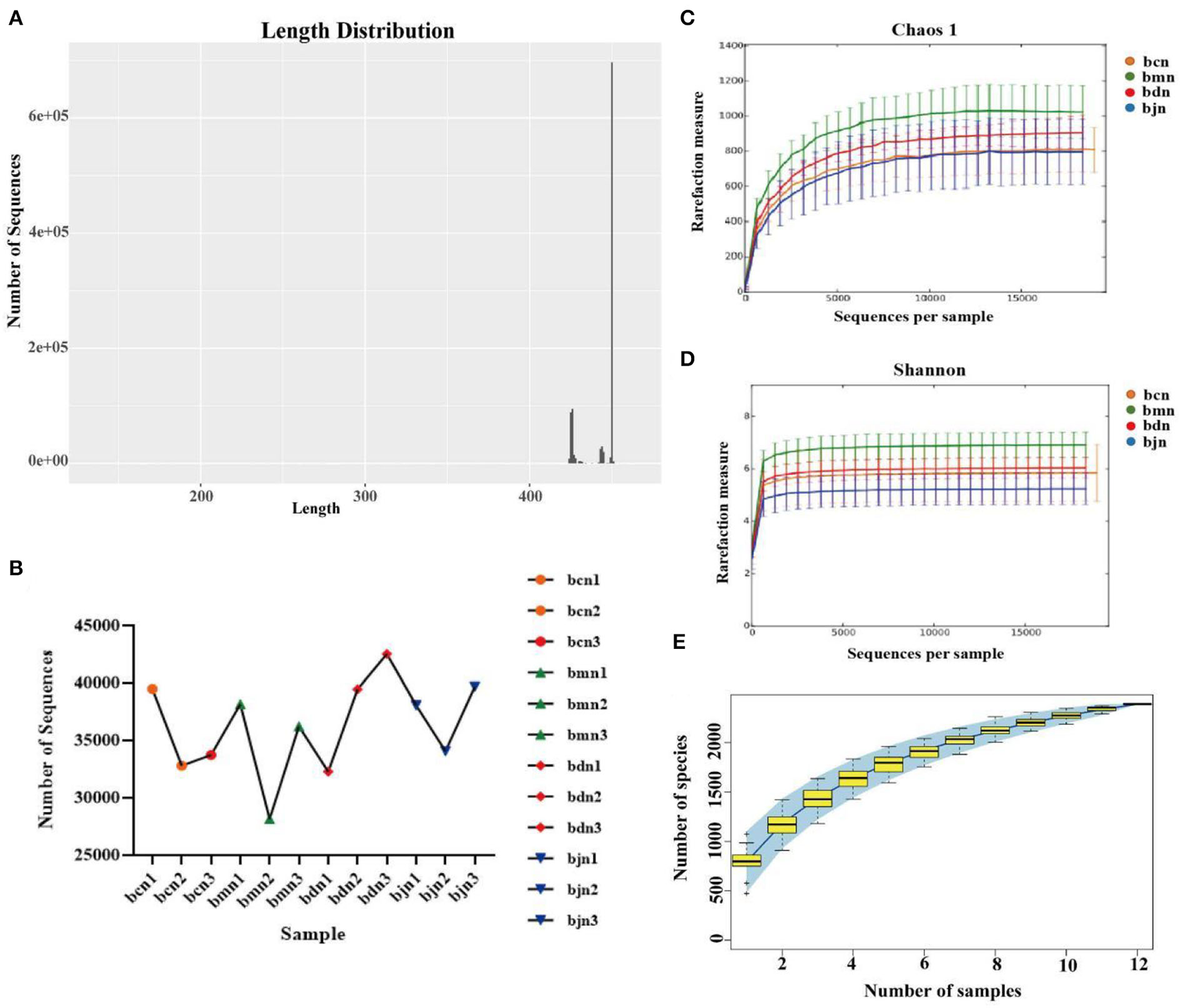 Sequencing data quality assessment of intestinal contents microbiota. (A) Sequence length distribution diagram. (B) The effective sequence quantity of each sample. (C) Dilution curve of Chaos 1. (D) Dilution curve of Shannon. (E) Species accumulation curve. bcn: normal saline-treated basal diet group; bmn: normal saline-treated high-fat diet group; bdn: DO traditional decoction-treated high-fat diet group; bjn: lipid-lowering decoction-treated high-fat diet group.